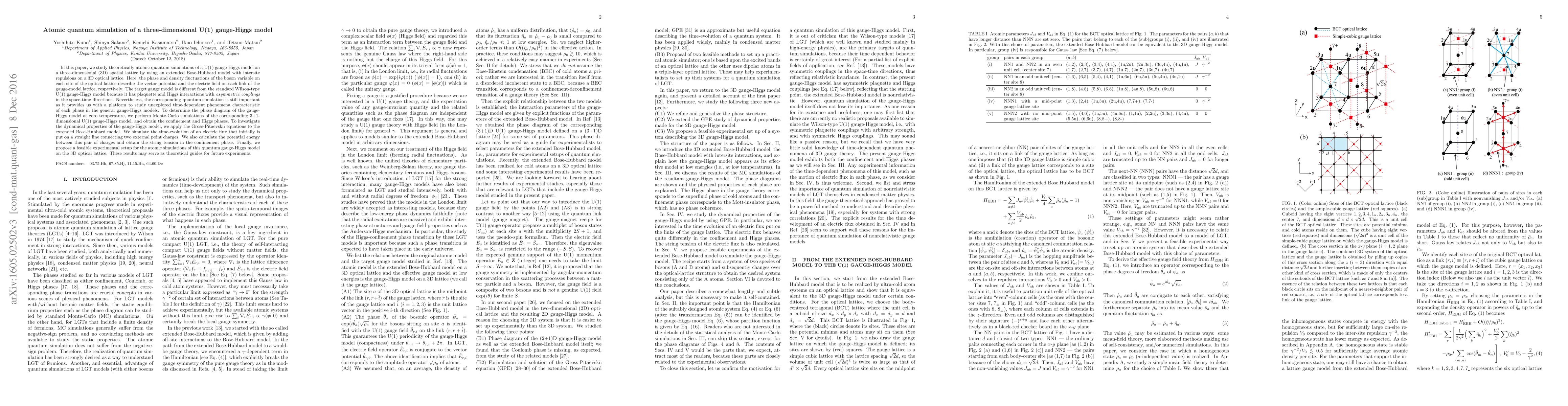 This paper theoretically explores atomic quantum simulations of a three-dimensional U(1) gauge-Higgs model using an extended Bose-Hubbard model on a 3D optical lattice. It identifies confinement and Higgs phases via Monte-Carlo simulations and proposes a feasible experimental setup for future atomic simulations.