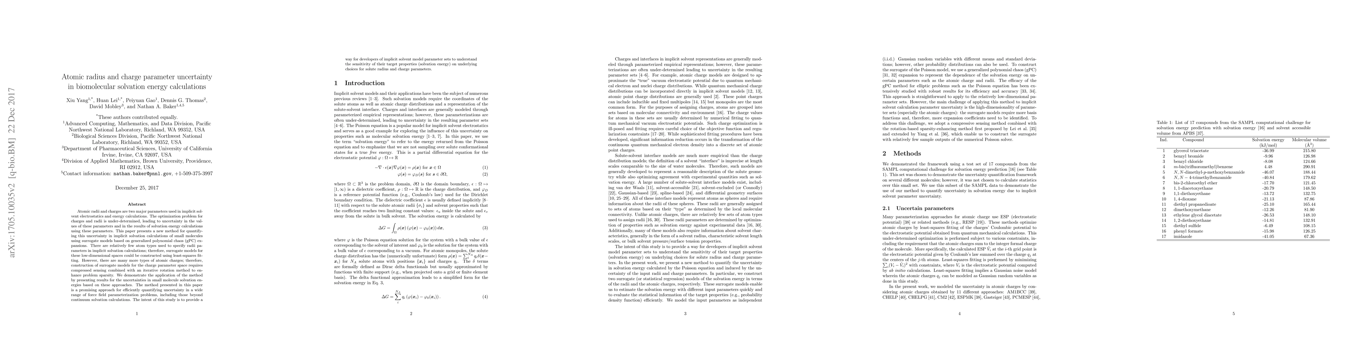 This paper introduces a new method for quantifying uncertainties in atomic radii and charge parameters in implicit solvation energy calculations, employing generalized polynomial chaos expansions and compressed sensing for surrogate models. The method aims to enhance understanding of the sensitivity of solvation energies to these parameters, offering a promising tool for force field parameterization.