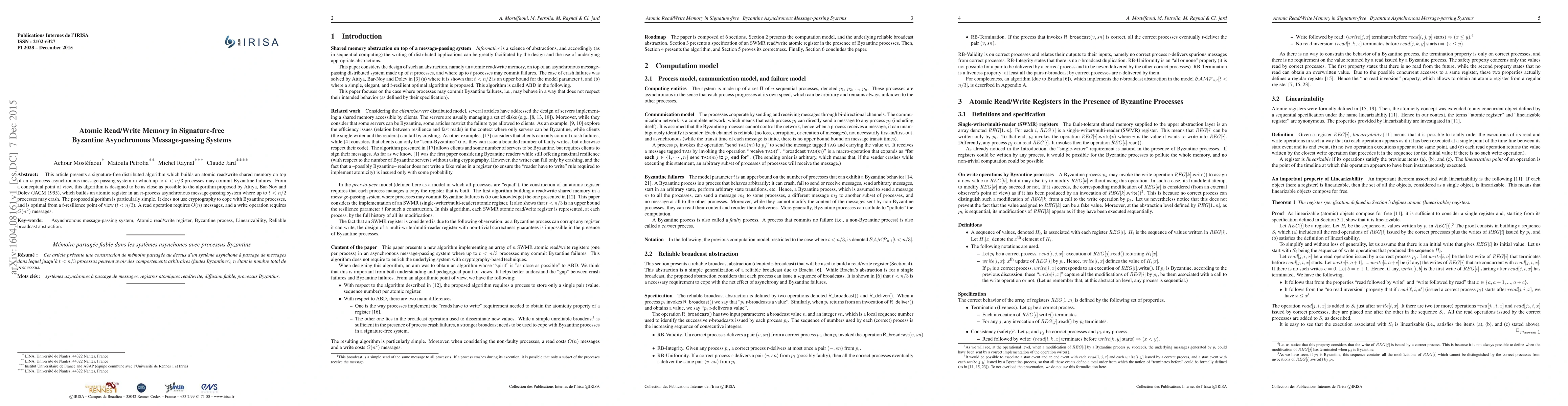 This paper introduces a signature-free algorithm for constructing an atomic read/write memory in a Byzantine asynchronous message-passing system, achieving optimal resilience against $t<n/3$ failures without using cryptography. The algorithm requires $O(n)$ messages for reads and $O(n^2)$ for writes.