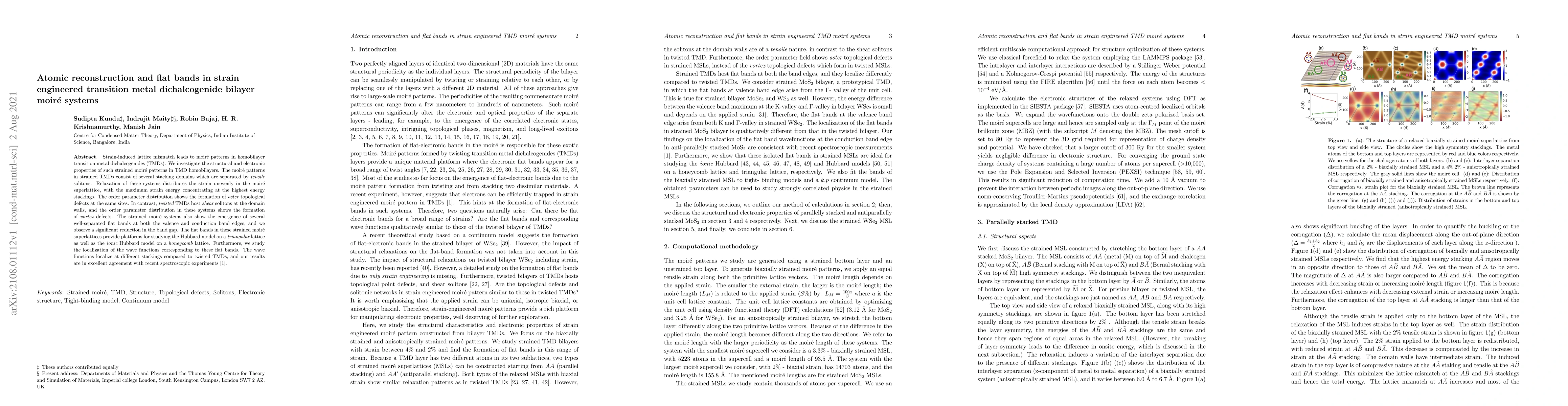 The paper presents a detailed analysis of atomic reconstruction and flat bands in strain-engineered TMD bilayer moiré systems, providing continuum model parameters and tight-binding model fits.