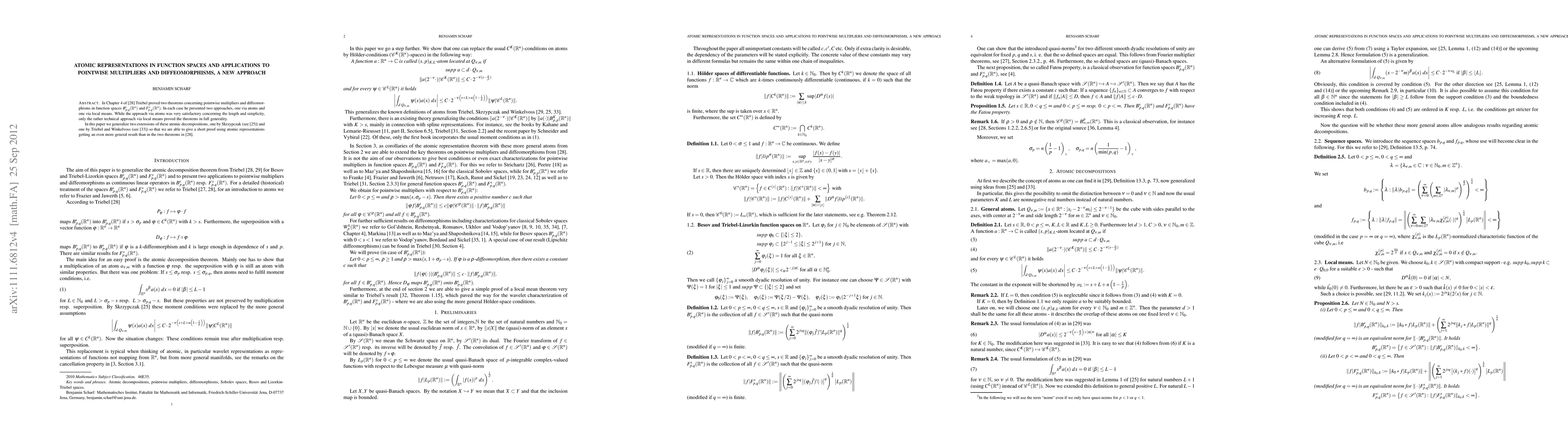 In Chapter 4 of [25] Triebel proved two theorems concerning pointwise multipliers and diffeomorphisms in function spaces of Besov and Triebel-Lizorkin type. In each case he presented two approaches, one via atoms and one via local means. While the approach via atoms was very satisfactory concerning the length and simplicity, only the rather technical approach via local means proved the theorems in full generality. In this paper we generalize two extensions of these atomic decompositions, one by Skrzypczak (see [22]) and one by Triebel and Winkelvoss (see [30]) so that we are able to give a short proof using atomic representations getting an even more general result than in the two theorems in [25]. References: [22] L. Skrzypczak. Atomic decompositions on manifolds with bounded geometry. Forum Math., 10(1):19-38, 1998. [25] H. Triebel. Theory of Function Spaces II. Birkh\"auser, Basel, 1992. [30] H. Triebel and H. Winkelvo{\ss}. Intrinsic atomic characterizations of function spaces on domains. Math. Z., 221(1):647-673, 1996.