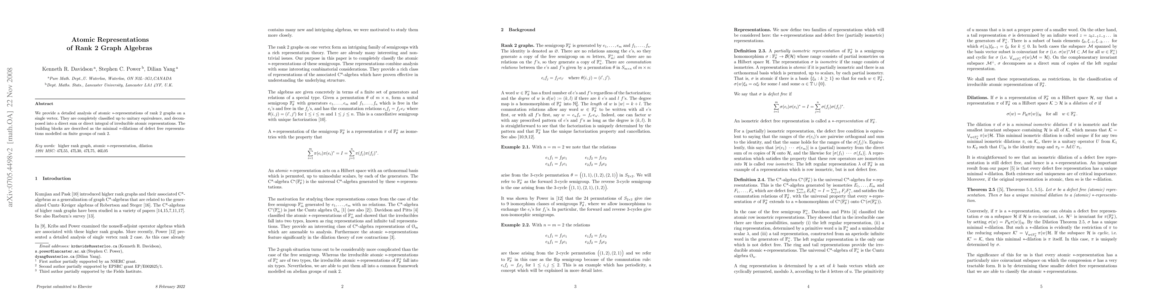 We provide a detailed analysis of atomic *-representations of rank 2 graphs on a single vertex. They are completely classified up to unitary equivalence, and decomposed into a direct sum or direct integral of irreducible atomic representations. The building blocks are described as the minimal *-dilations of defect free representations modelled on finite groups of rank 2.