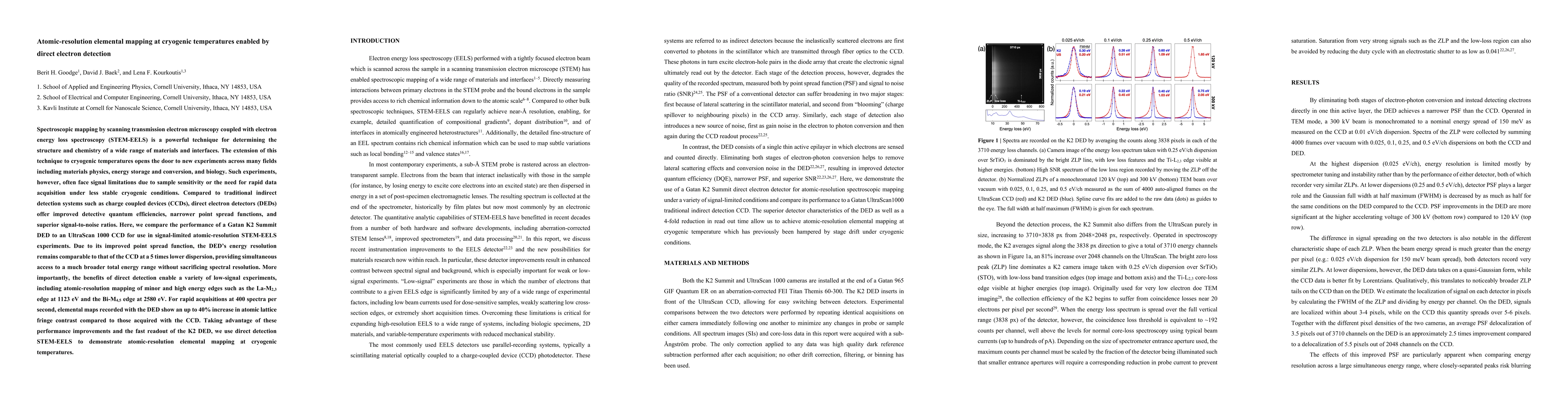 This paper demonstrates the superior performance of direct electron detectors (DEDs) in cryogenic scanning transmission electron microscopy (STEM-EELS) compared to traditional CCDs, enabling atomic-resolution elemental mapping. The DED provides a 40% increase in atomic lattice fringe contrast and allows for mapping of high-energy edges, enhancing experiments in materials physics, energy storage, and biology.