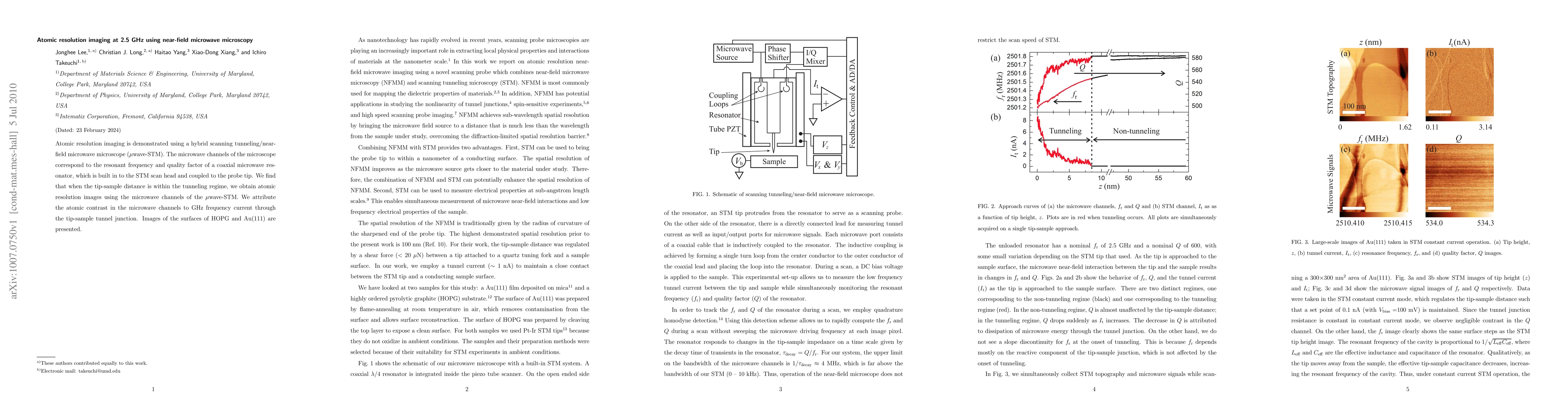 Atomic resolution imaging is demonstrated using a hybrid scanning tunneling/near-field microwave microscope (microwave-STM). The microwave channels of the microscope correspond to the resonant frequency and quality factor of a coaxial microwave resonator, which is built in to the STM scan head and coupled to the probe tip. We find that when the tip-sample distance is within the tunneling regime, we obtain atomic resolution images using the microwave channels of the microwave-STM. We attribute the atomic contrast in the microwave channels to GHz frequency current through the tip-sample tunnel junction. Images of the surfaces of HOPG and Au(111) are presented.