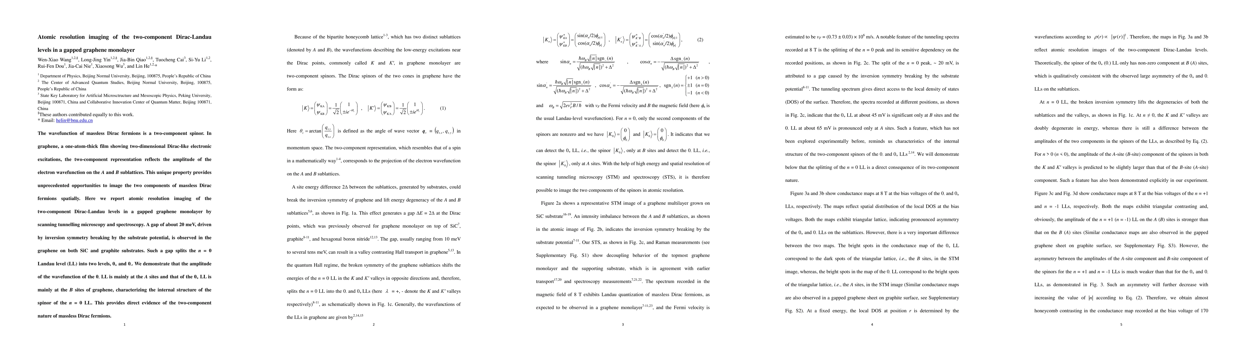 The study utilizes scanning tunneling microscopy to achieve atomic resolution imaging of the two-component Dirac-Landau levels in gapped graphene, revealing the spatial distribution of electron wavefunctions on the A and B sublattices and confirming the two-component nature of massless Dirac fermions.