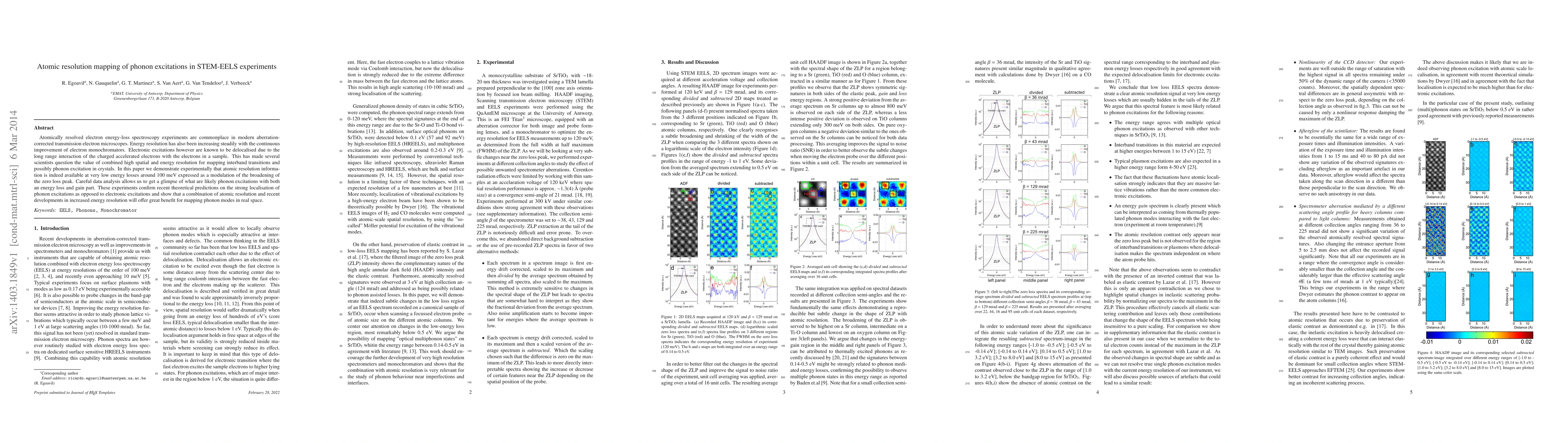 This paper demonstrates atomic resolution mapping of phonon excitations in STEM-EELS experiments, showing that atomic resolution information is attainable at low energy losses, confirming theoretical predictions of phonon localization and highlighting the benefits of combining high spatial and energy resolution for phonon mode mapping.