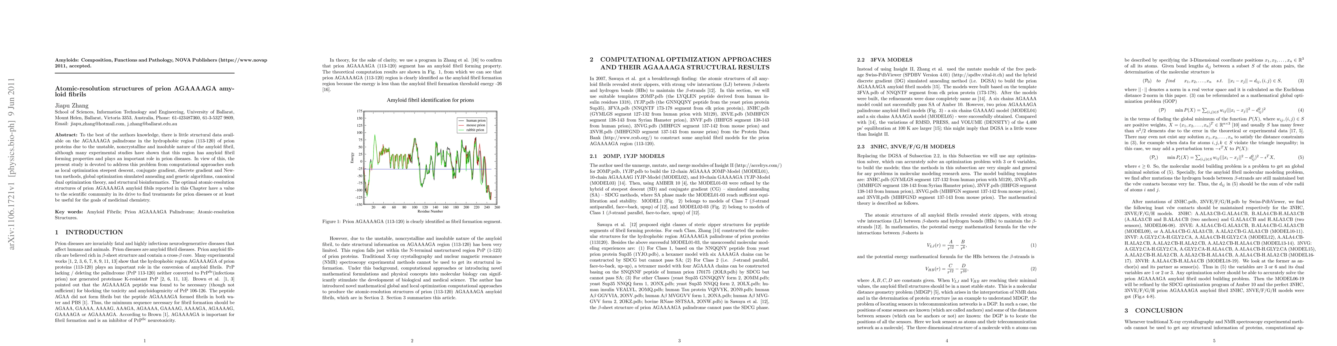 To the best of the author's knowledge, there is little structural data available on the AGAAAAGA palindrome in the hydrophobic region (113-120) of prion proteins due to the unstable, noncrystalline and insoluble nature of the amyloid fibril, although many experimental studies have shown that this region has amyloid fibril forming properties and plays an important role in prion diseases. In view of this, the present study is devoted to address this problem from computational approaches such as local optimization steepest descent, conjugate gradient, discrete gradient and Newton methods, global optimization simulated annealing and genetic algorithms, canonical dual optimization theory, and structural bioinformatics. The optimal atomic-resolution structures of prion AGAAAAGA amyloid fibils reported in this Chapter have a value to the scientific community in its drive to find treatments for prion diseases or at least be useful for the goals of medicinal chemistry.