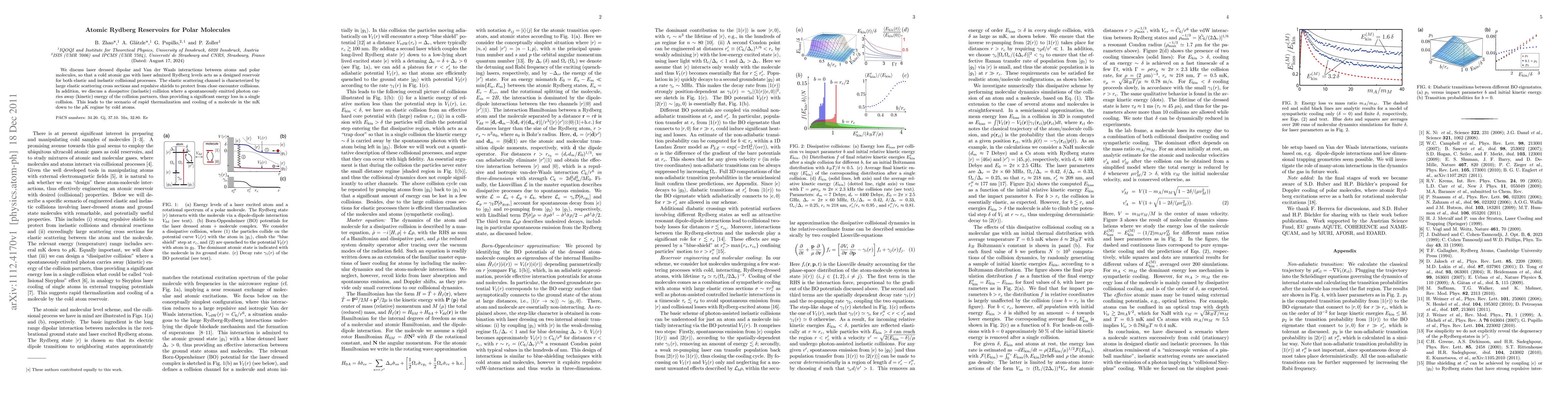 We discuss laser dressed dipolar and Van der Waals interactions between atoms and polar molecules, so that a cold atomic gas with laser admixed Rydberg levels acts as a designed reservoir for both elastic and inelastic collisional processes. The elastic scattering channel is characterized by large elastic scattering cross sections and repulsive shields to protect from close encounter collisions. In addition, we discuss a dissipative (inelastic) collision where a spontaneously emitted photon carries away (kinetic) energy of the collision partners, thus providing a significant energy loss in a single collision. This leads to the scenario of rapid thermalization and cooling of a molecule in the mK down to the \mu K regime by cold atoms.