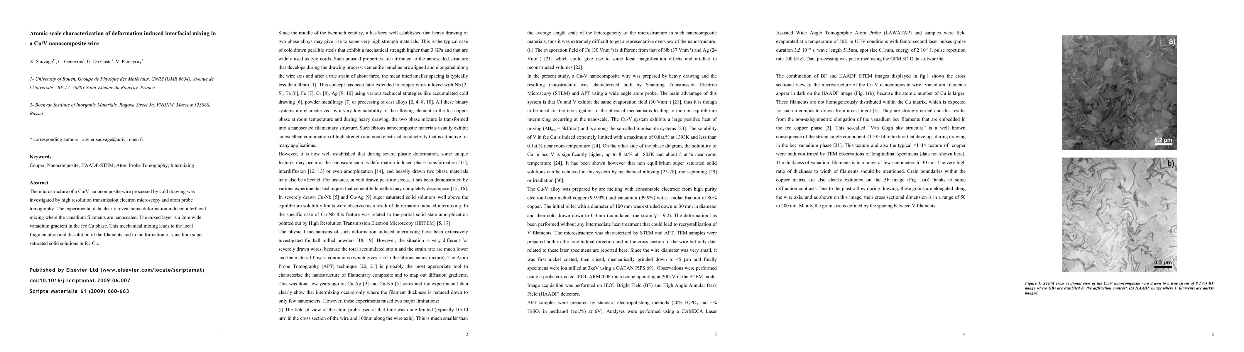 Researchers studied a Cu/V nanocomposite wire and found deformation-induced interfacial mixing, where vanadium filaments mix with copper, leading to fragmentation and the formation of vanadium-saturated solid solutions.