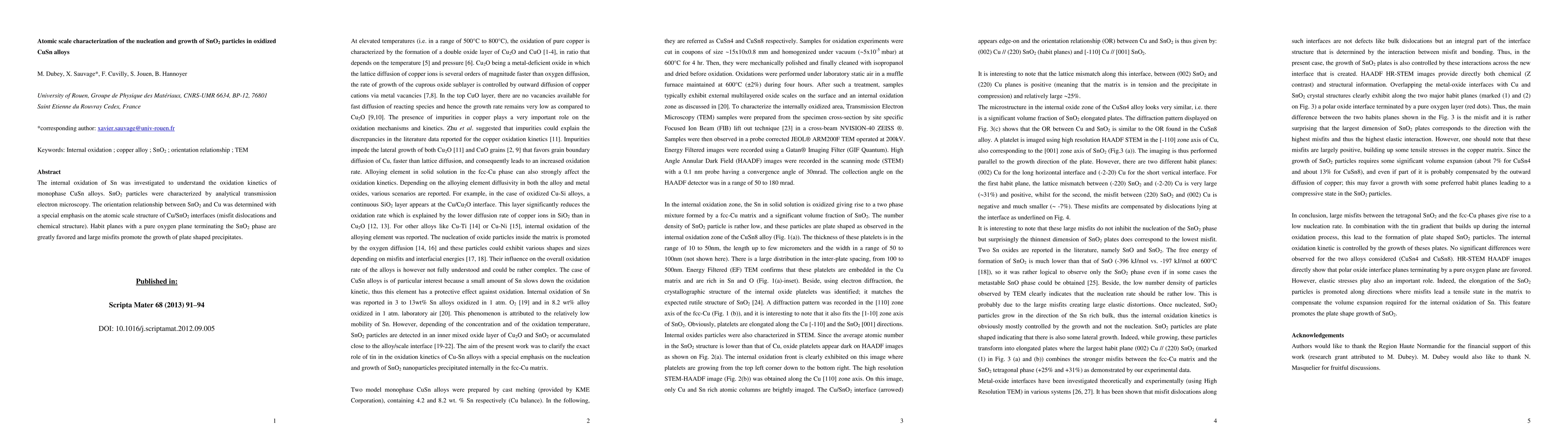 The internal oxidation of Sn was investigated to understand the oxidation kinetics of monophase CuSn alloys. SnO2 particles were characterized by analytical transmission electron microscopy. The orientation relationship between SnO2 and Cu was determined with a special emphasis on the atomic scale structure of Cu/SnO2 interfaces (misfit dislocations and chemical structure). Habit planes with a pure oxygen plane terminating the SnO2 phase are greatly favored and large misfits promote the growth of plate shaped precipitates.