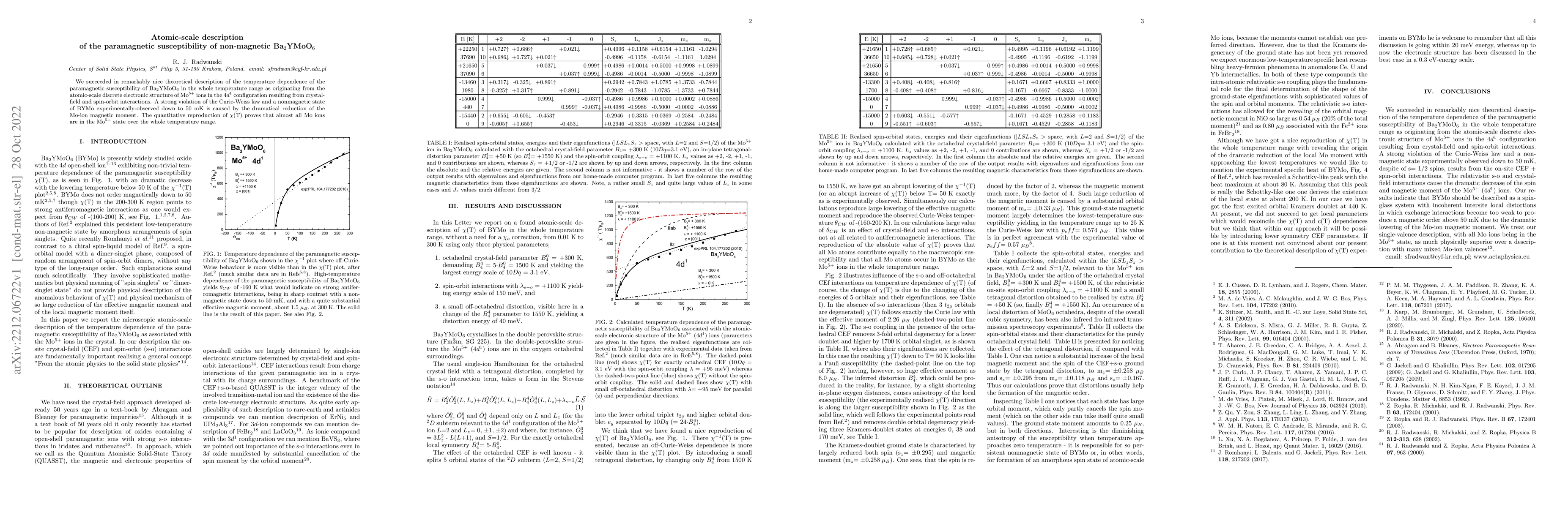 We succeeded in remarkably nice theoretical description of the temperature dependence of the paramagnetic susceptibility of Ba$_2$YMoO$_6$ in the whole temperature range as originating from the atomic-scale discrete electronic structure of Mo$^{5+}$ ions in the 4d$^1$ configuration resulting from crystal-field and spin-orbit interactions. A strong violation of the Curie-Weiss law and a nonmagnetic state of BYMo experimentally-observed down to 50 mK is caused by the dramatical reduction of the Mo-ion magnetic moment. The quantitative reproduction of $\chi$(T) proves that almost all Mo ions are in the Mo$^{5+}$ state over the whole temperature range.