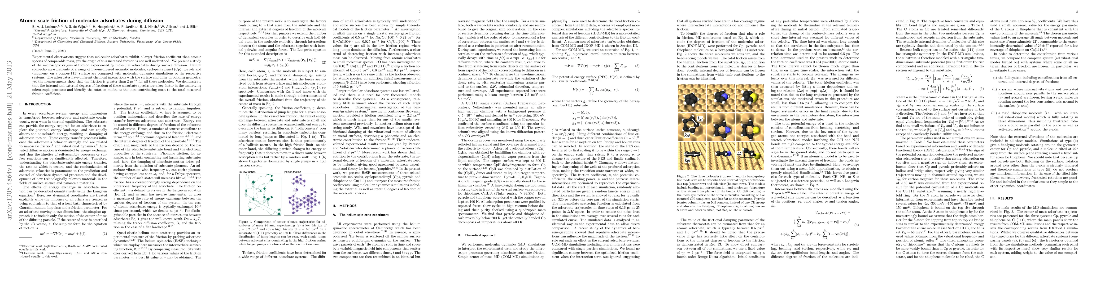 Experimental observations suggest that molecular adsorbates exhibit a larger friction coefficient than atomic species of comparable mass, yet the origin of this increased friction is not well understood. We present a study of the microscopic origins of friction experienced by molecular adsorbates during surface diffusion. Helium spin-echo measurements of a range of five-membered aromatic molecules, cyclopentadienyl (Cp), pyrrole and thiophene, on a copper(111) surface are compared with molecular dynamics simulations of the respective systems. The adsorbates have different chemical interactions with the surface and differ in bonding geometry, yet the measurements show that the friction is greater than 2 ps$^{-1}$ for all these molecules. We demonstrate that the internal and external degrees of freedom of these adsorbate species are a key factor in the underlying microscopic processes and identify the rotation modes as the ones contributing most to the total measured friction coefficient.