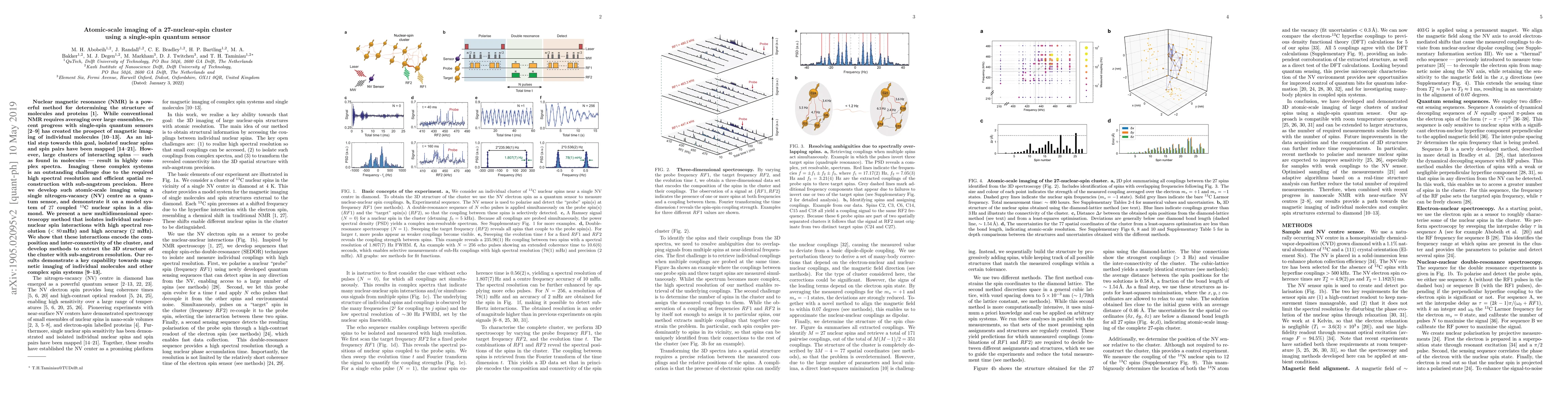 This paper presents a novel method for atomic-scale imaging of a 27-nuclear-spin cluster using a single nitrogen-vacancy quantum sensor, achieving high spectral resolution and sub-angstrom precision to reconstruct the 3D structure of the cluster. The method demonstrates the potential for magnetic imaging of individual molecules and complex spin systems.