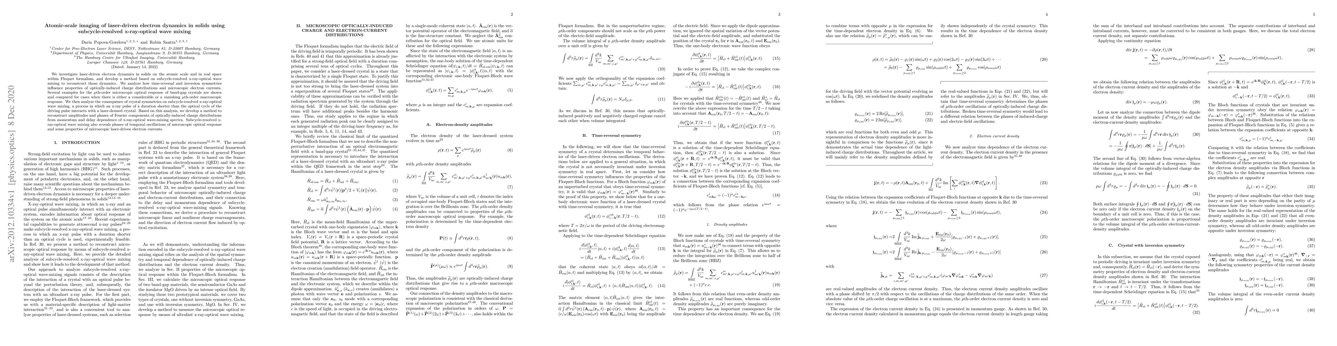 This paper develops a method for atomic-scale imaging of laser-driven electron dynamics in solids using subcycle-resolved x-ray-optical wave mixing, revealing the influence of symmetries on optically-induced charge distributions and electron currents. The method reconstructs Fourier components of charge distributions from x-ray-optical wave-mixing spectra, providing insights into microscopic optical responses.