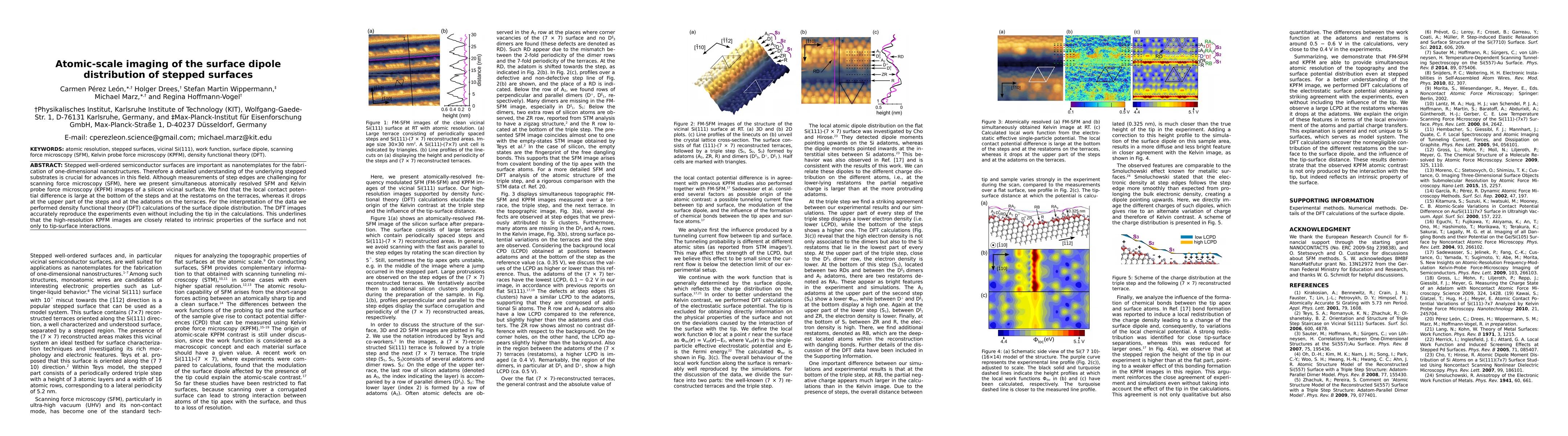 This paper presents atomically resolved scanning force microscopy and Kelvin probe force microscopy images of a silicon vicinal surface, revealing non-homogeneous local contact potential differences due to differences in surface dipole distribution at step edges, explained by a Smoluchowski-type effect. Density functional theory calculations confirm these findings, highlighting intrinsic surface properties rather than tip-surface interactions.
