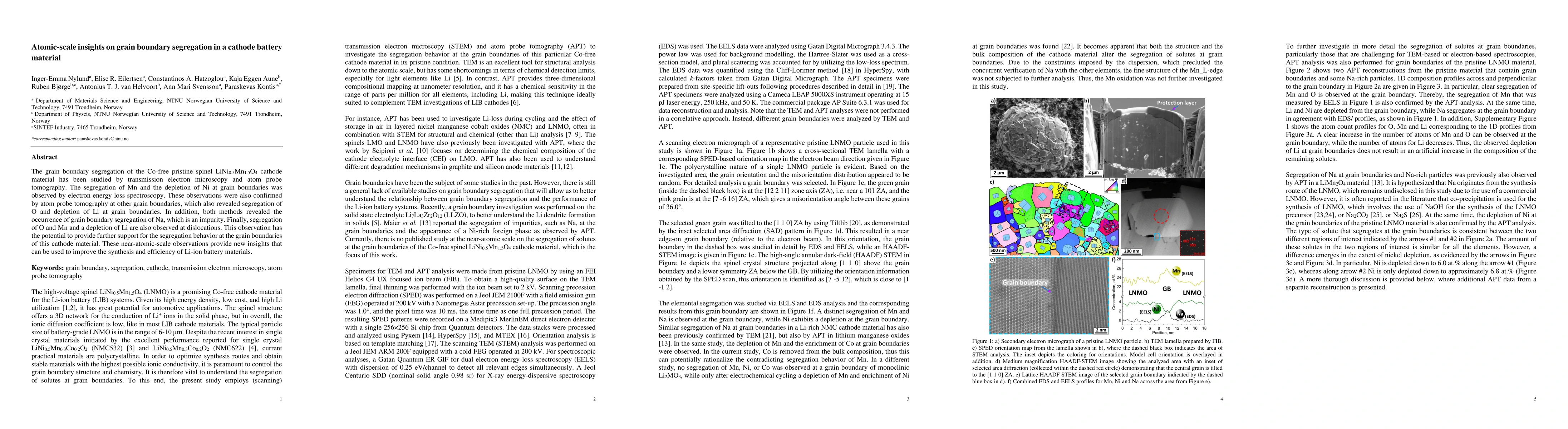 The grain boundary segregation of the Co-free pristine spinel LiNi0.5Mn1.5O4 cathode material has been studied by transmission electron microscopy and atom probe tomography. The segregation of Mn and the depletion of Ni at grain boundaries was observed by electron energy loss spectroscopy. These observations were also confirmed by atom probe tomography at other grain boundaries, which also revealed segregation of O and depletion of Li at grain boundaries. In addition, both methods revealed the occurrence of grain boundary segregation of Na, which is an impurity. Finally, segregation of O and Mn and a depletion of Li are also observed at dislocations. This observation has the potential to provide further support for the segregation behavior at the grain boundaries of this cathode material. These near-atomic-scale observations provide new insights that can be used to improve the synthesis and efficiency of Li-ion battery materials.