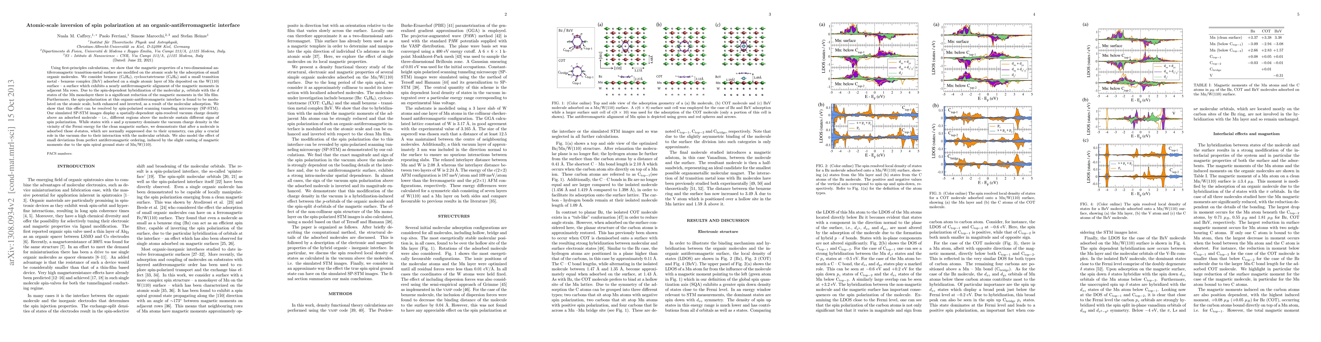 Using first-principles calculations, we show that the magnetic properties of a two-dimensional antiferromagnetic transition-metal surface are modified on the atomic scale by the adsorption of small organic molecules. We consider benzene (C6H6), cyclooctatetraene (C8H8) and a small transition metal - benzene complex (BzV) adsorbed on a single atomic layer of Mn deposited on the W(110) surface -- a surface which exhibits a nearly antiferromagnetic alignment of the magnetic moments in adjacent Mn rows. Due to the spin-dependent hybridization of the molecular pz orbitals with the d states of the Mn monolayer there is a significant reduction of the magnetic moments in the Mn film. Furthermore, the spin-polarization at this organic-antiferromagnetic interface is found to be modulated on the atomic scale, both enhanced and inverted, as a result of the molecular adsorption. We show that this effect can be resolved by spin-polarized scanning tunneling microscopy (SP-STM). Our simulated SP-STM images display a spatially-dependent spin-resolved vacuum charge density above an adsorbed molecule -- i.e., different regions above the molecule sustain different signs of spin polarization. While states with s and p symmetry dominate the vacuum charge density in the vicinity of the Fermi energy for the clean magnetic surface, we demonstrate that after a molecule is adsorbed those d-states, which are normally suppressed due to their symmetry, can play a crucial role in the vacuum due to their interaction with the molecular orbitals. We also model the effect of small deviations from perfect antiferromagnetic ordering, induced by the slight canting of magnetic moments due to the spin spiral ground state of Mn/W(110).