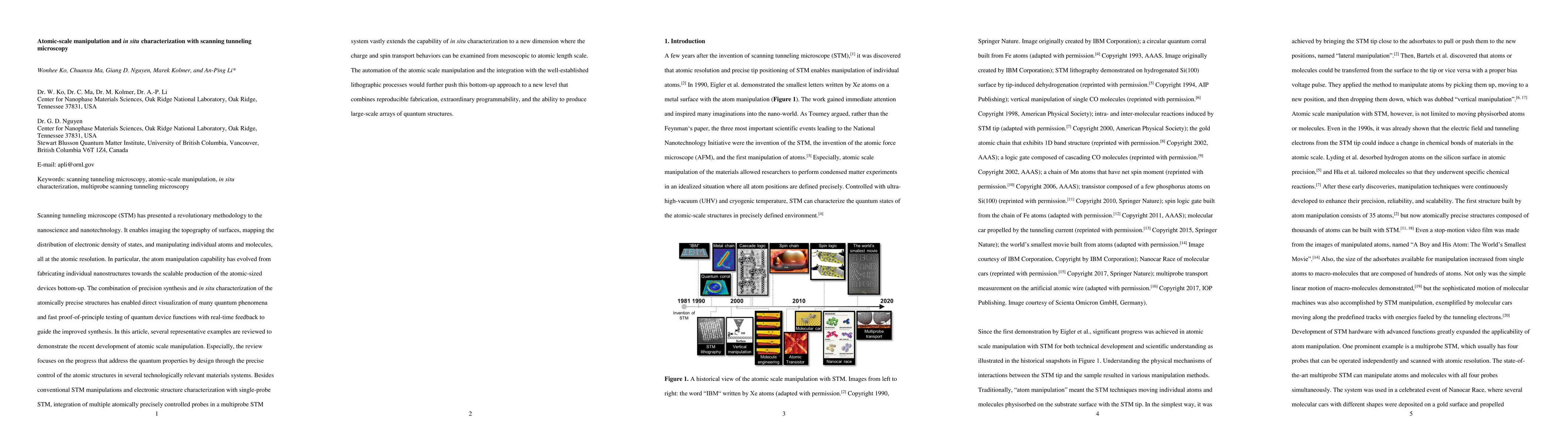 This paper reviews the advancements in scanning tunneling microscopy (STM) for atomic-scale manipulation and in situ characterization, highlighting its role in fabricating nanoscale devices and visualizing quantum phenomena. It emphasizes the integration of multiple probes for enhanced charge and spin transport analysis, and the potential of automation and lithographic integration for scalable quantum structure production.