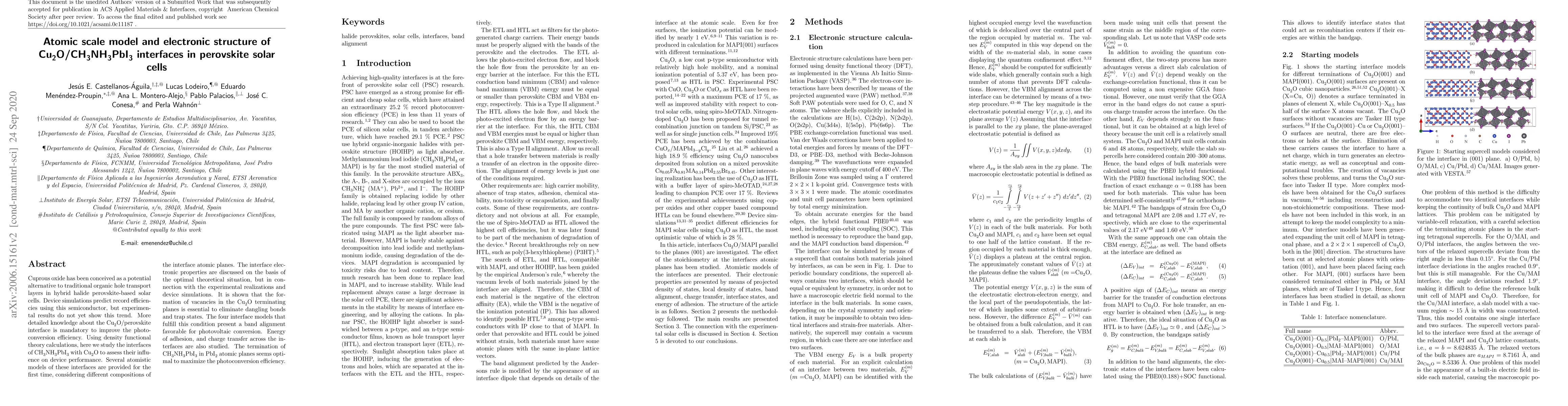 Researchers used density functional theory to study the interface between Cu2O and CH3NH3PbI3 in perovskite solar cells, finding that eliminating dangling bonds requires vacancies on the Cu2O surface and that PbI2 termination is optimal for high efficiency.