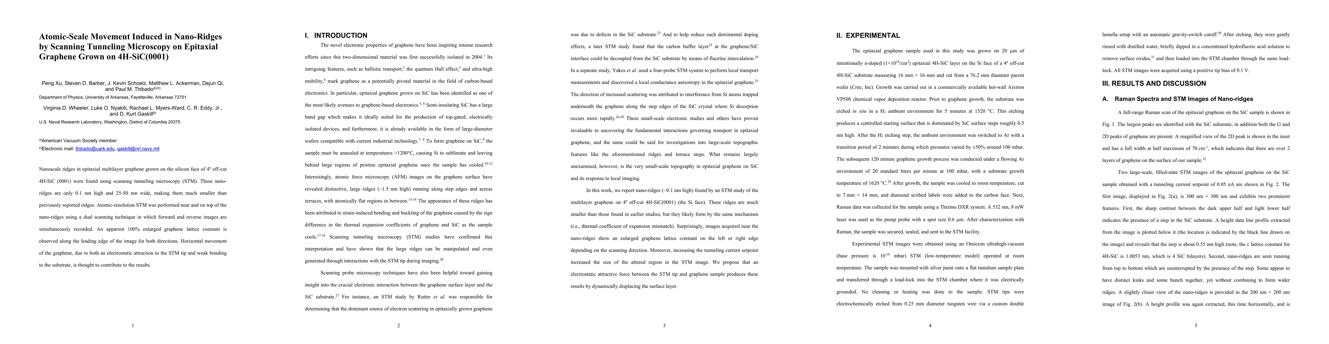 Nanoscale ridges in epitaxial multilayer graphene grown on the silicon face of 4 degree off-cut 4H-SiC (0001) were found using scanning tunneling microscopy (STM). These nano-ridges are only 0.1 nm high and 25-50 nm wide, making them much smaller than previously reported ridges. Atomic-resolution STM was performed near and on top of the nano-ridges using a dual scanning technique in which forward and reverse images are simultaneously recorded. An apparent 100% enlarged graphene lattice constant is observed along the leading edge of the image for both directions. Horizontal movement of the graphene, due to both an electrostatic attraction to the STM tip and weak bonding to the substrate, is thought to contribute to the results.