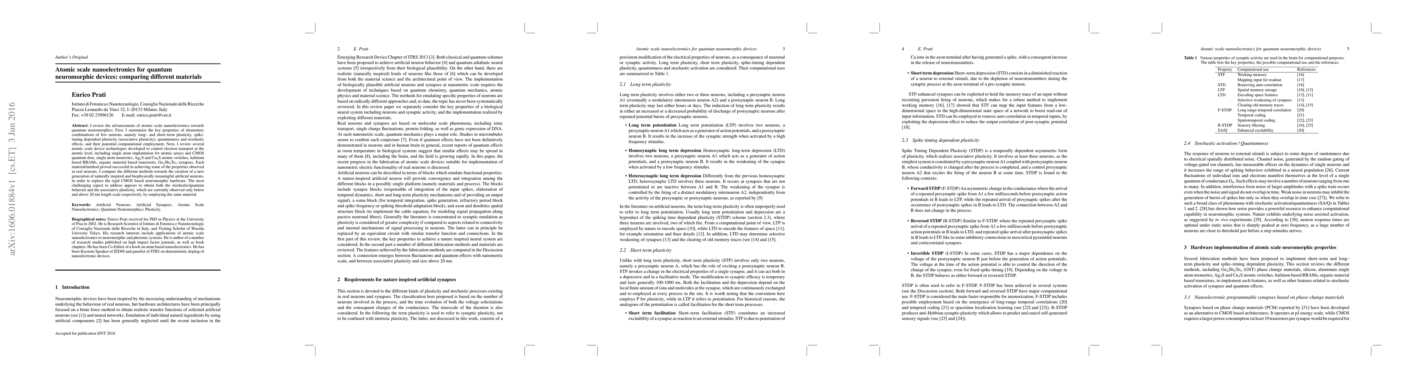 I review the advancements of atomic scale nanoelectronics towards quantum neuromorphics. First, I summarize the key properties of elementary combinations of few neurons, namely long-- and short--term plasticity, spike-timing dependent plasticity (associative plasticity), quantumness and stochastic effects, and their potential computational employment. Next, I review several atomic scale device technologies developed to control electron transport at the atomic level, including single atom implantation for atomic arrays and CMOS quantum dots, single atom memories, Ag$_2$S and Cu$_2$S atomic switches, hafnium based RRAMs, organic material based transistors, Ge$_2$Sb$_2$Te$_5$ synapses. Each material/method proved successful in achieving some of the properties observed in real neurons. I compare the different methods towards the creation of a new generation of naturally inspired and biophysically meaningful artificial neurons, in order to replace the rigid CMOS based neuromorphic hardware. The most challenging aspect to address appears to obtain both the stochastic/quantum behavior and the associative plasticity, which are currently observed only below and above 20 nm length scale respectively, by employing the same material.