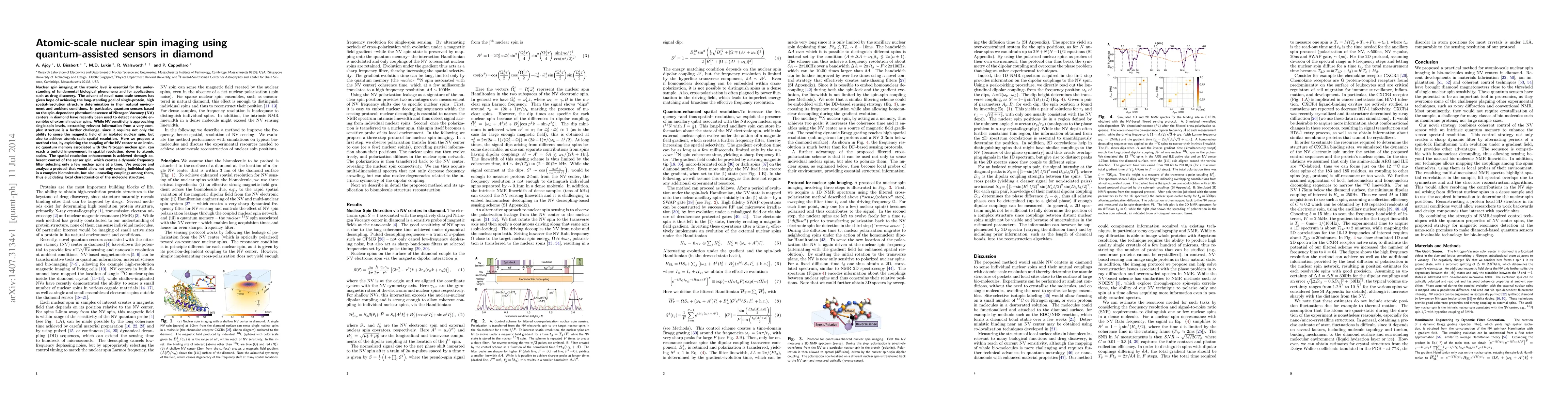 This paper proposes a method using quantum-assisted NV center sensors in diamond to achieve atomic-scale nuclear spin imaging, enhancing spatial resolution by a factor of ten through coherent control and dynamic frequency filtering, enabling the detection and analysis of individual nuclear spins within complex biomolecules.