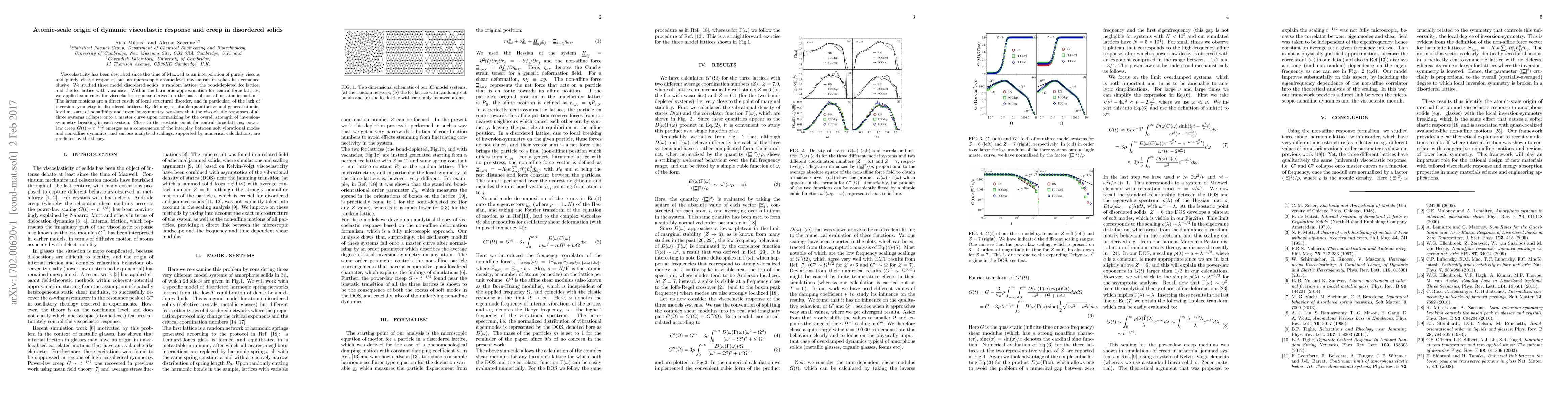 This paper explores the atomic-level mechanisms behind viscoelastic response and creep in disordered solids, revealing that non-affine atomic motions due to structural disorder and inversion-symmetry breaking govern the viscoelastic behavior. The study predicts analytical scalings for power-law creep near the isostatic point, supported by numerical simulations.