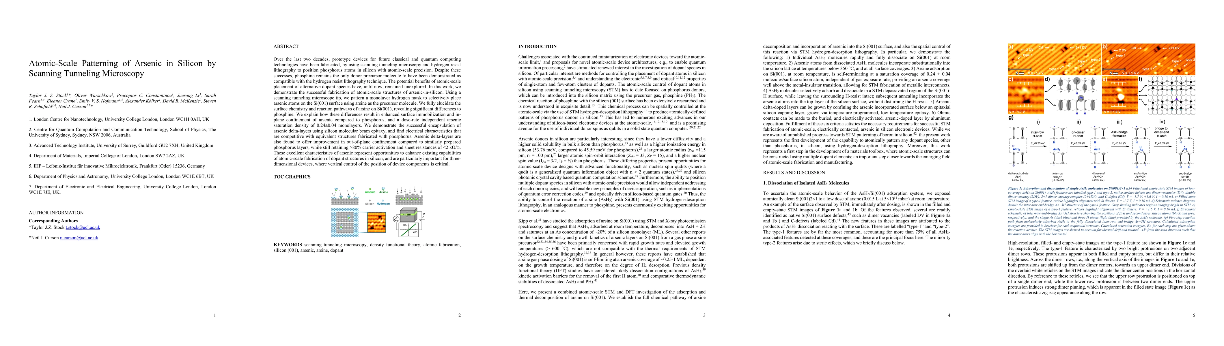 This paper demonstrates the successful atomic-scale placement of arsenic atoms in silicon using scanning tunneling microscopy and arsine as the precursor, revealing significant differences in surface chemistry compared to phosphorus. The results show improved out-of-plane confinement and competitive electrical characteristics, suggesting potential enhancements in three-dimensional device fabrication.