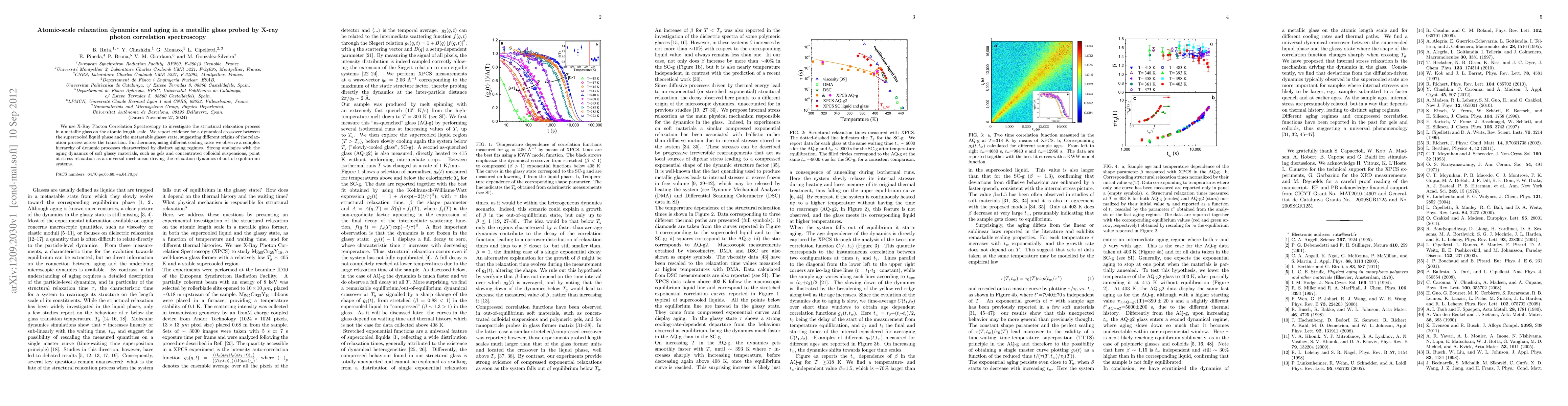 This paper employs X-Ray Photon Correlation Spectroscopy to explore atomic-scale relaxation dynamics in metallic glass, revealing a dynamical crossover between supercooled and glassy states. The study identifies distinct aging regimes influenced by cooling rates, suggesting stress relaxation as a universal mechanism for relaxation dynamics in out-of-equilibrium systems.