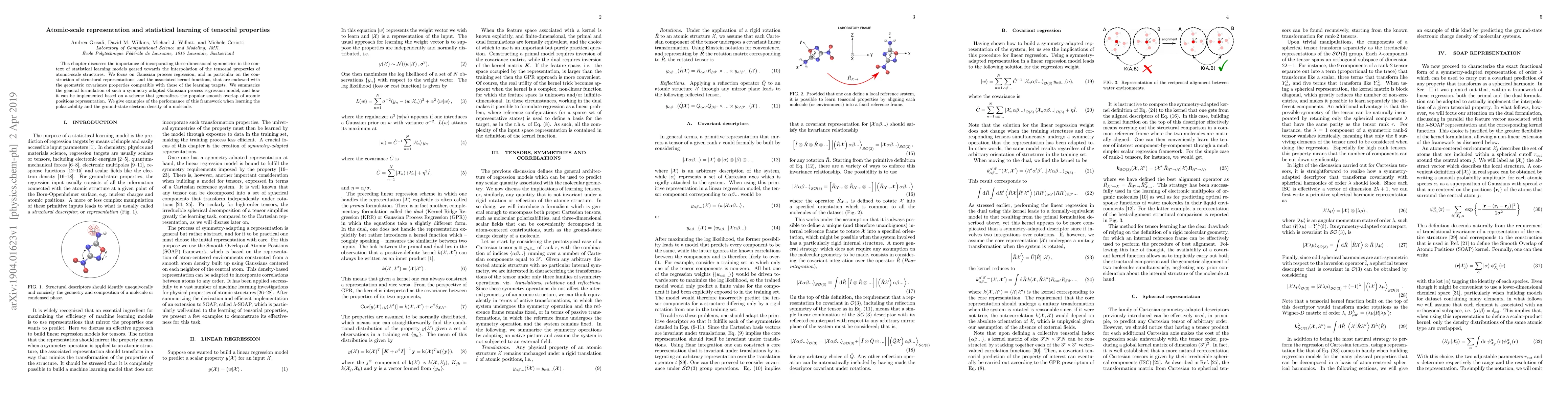 This chapter discusses the importance of incorporating three-dimensional symmetries in the context of statistical learning models geared towards the interpolation of the tensorial properties of atomic-scale structures. We focus on Gaussian process regression, and in particular on the construction of structural representations, and the associated kernel functions, that are endowed with the geometric covariance properties compatible with those of the learning targets. We summarize the general formulation of such a symmetry-adapted Gaussian process regression model, and how it can be implemented based on a scheme that generalizes the popular smooth overlap of atomic positions representation. We give examples of the performance of this framework when learning the polarizability and the ground-state electron density of a molecule.