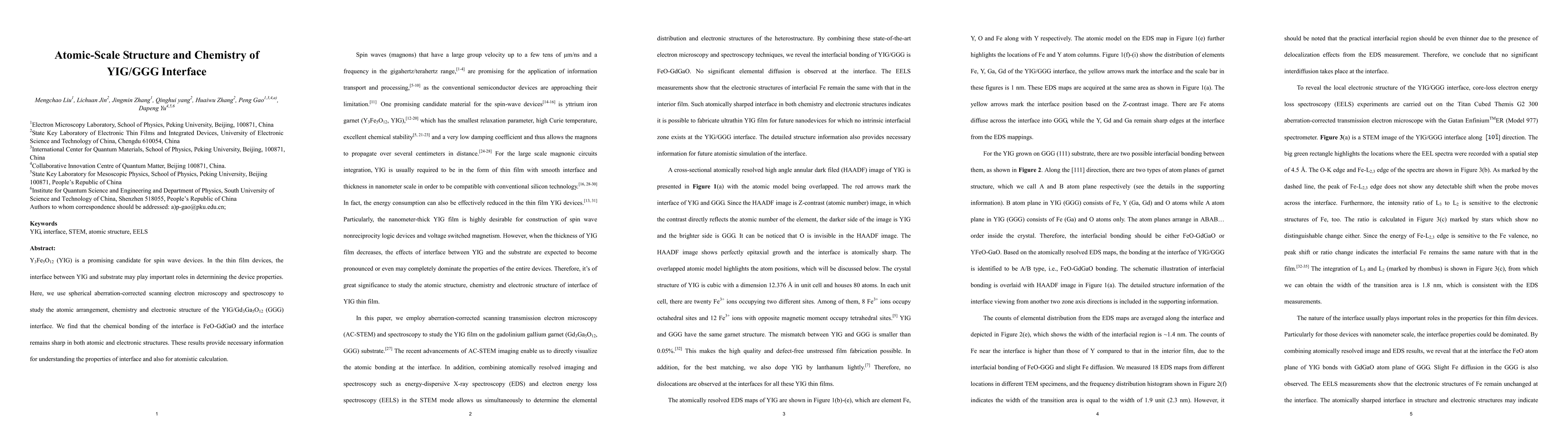 The research uses advanced SEM techniques to reveal that the YIG/GGG interface has sharp atomic and electronic structures with FeO-GdGaO chemical bonding, providing crucial insights for spin wave device properties and atomistic calculations.