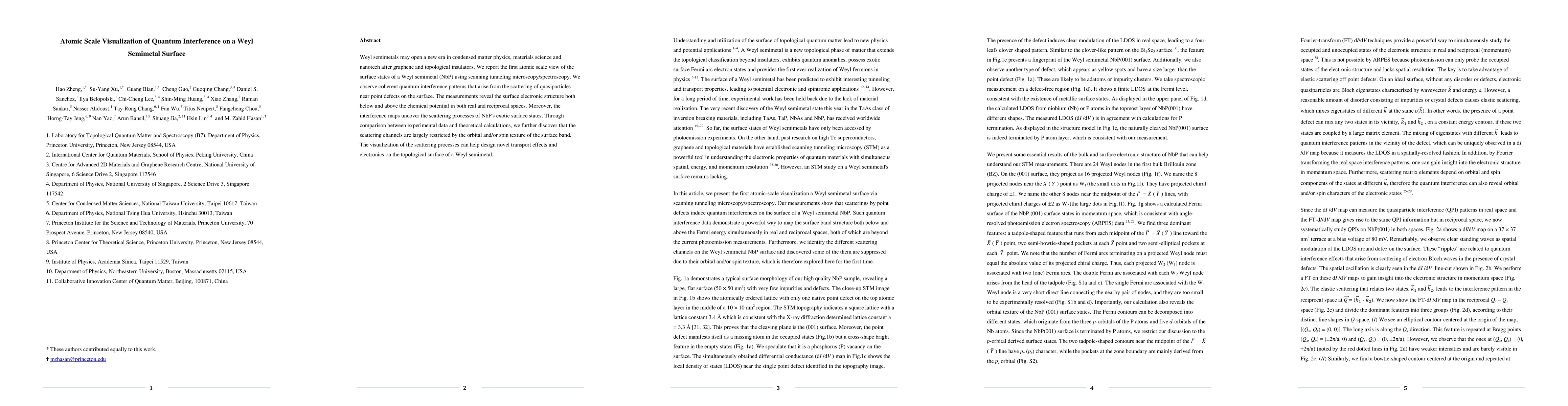 This paper reports the first atomic-scale visualization of Weyl semimetal (NbP) surface states using scanning tunneling microscopy/spectroscopy, revealing coherent quantum interference patterns from quasiparticle scattering near defects. The study uncovers the scattering processes and suggests that these are restricted by the surface band's orbital and spin texture, potentially aiding the design of novel electronic devices.