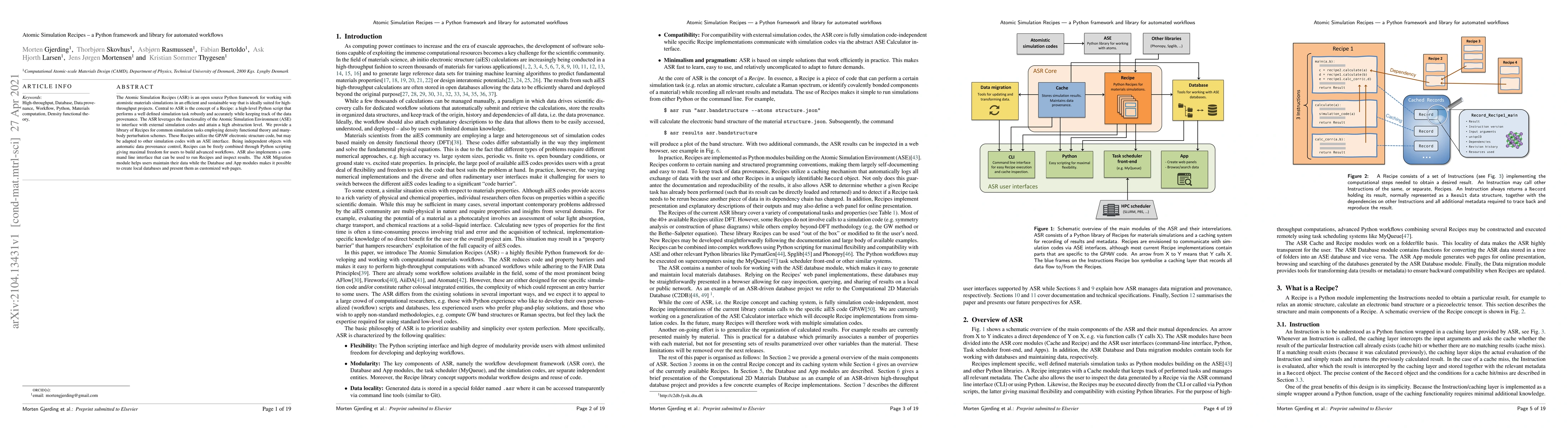 The Atomic Simulation Recipes (ASR) framework is an open-source Python tool for efficient and sustainable atomistic material simulations, particularly for high-throughput projects, utilizing the Atomic Simulation Environment (ASE) and GPAW for density functional theory tasks. It enables users to create and combine high-level Recipes for simulation tasks with automatic data provenance tracking.