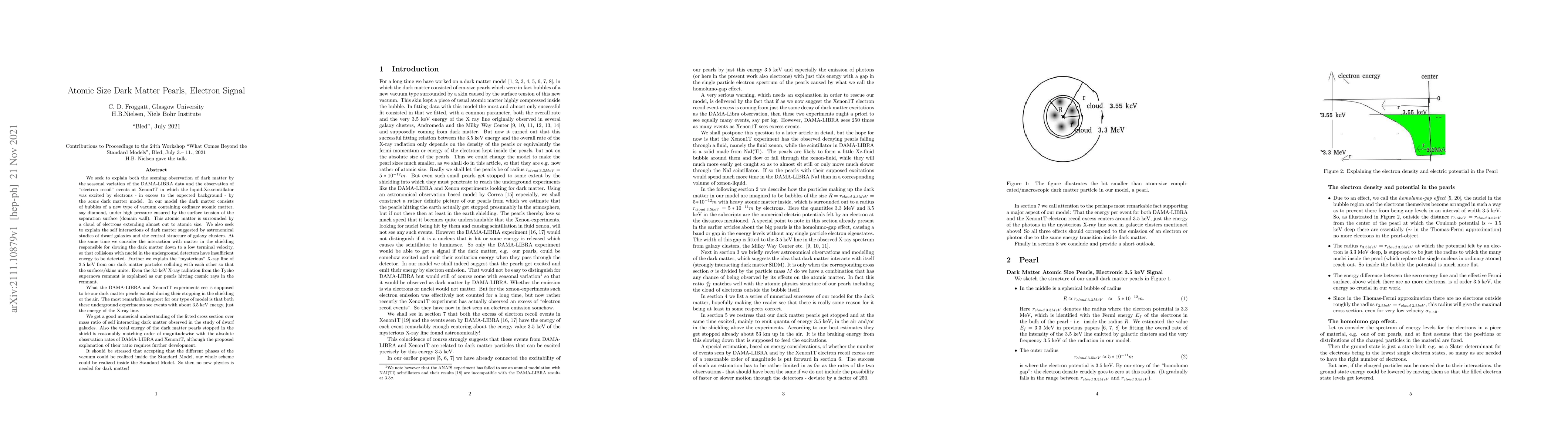 This paper proposes a novel dark matter model consisting of "pearls" — bubbles of a new vacuum type containing high-pressure atomic matter, surrounded by electron clouds. It explains observations from DAMA-LIBRA and Xenon1T experiments, the 3.5 keV X-ray line, and self-interactions of dark matter, all without requiring new physics beyond the Standard Model.