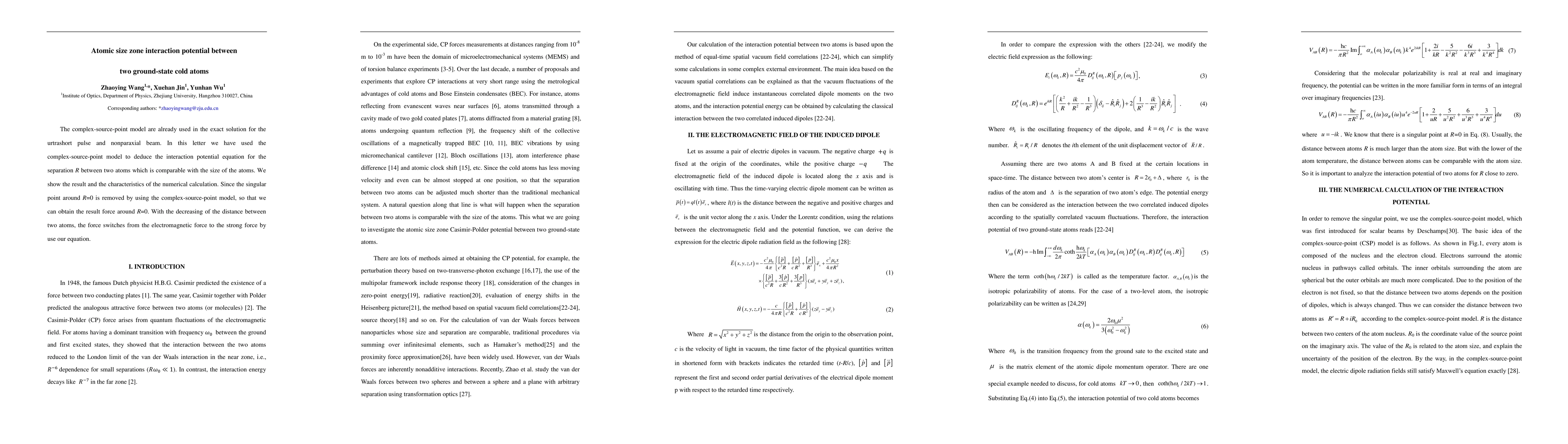 The complex-source-point model are already used in the exact solution for the urtrashort pulse and nonparaxial beam. In this letter we have used the complex-source-point model to deduce the interaction potential equation for the separation R between two atoms which is comparable with the size of the atoms. We show the result and the characteristics of the numerical calculation. Since the singular point around R=0 is removed by using the complex-source-point model, so that we can obtain the result force around R=0. With the decreasing of the distance between two atoms, the force switches from the electromagnetic force to the strong force by use our equation.