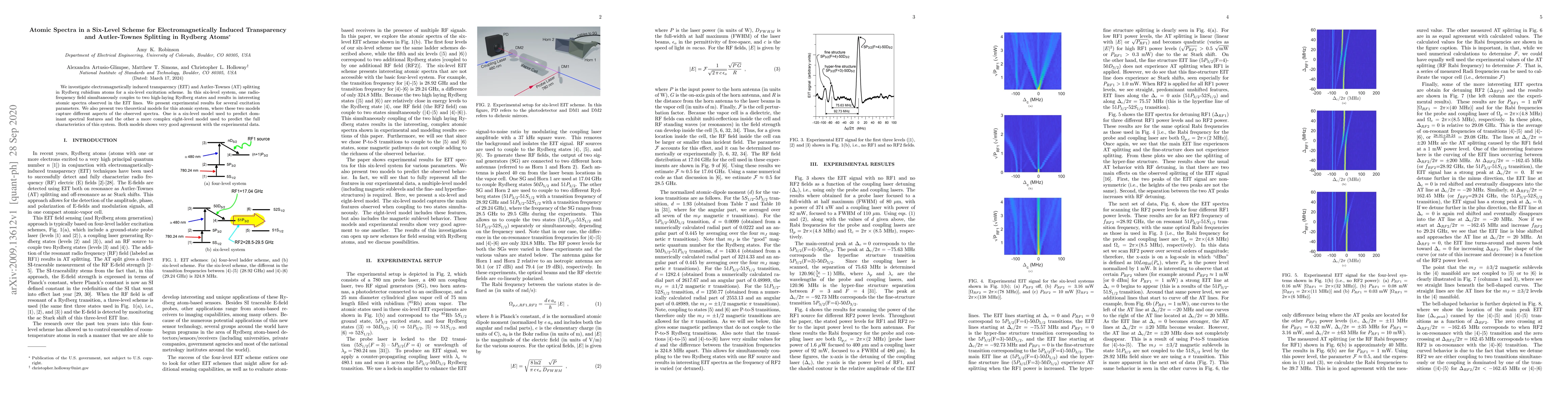 This paper explores electromagnetically induced transparency (EIT) and Autler-Townes splitting in Rydberg rubidium atoms within a six-level excitation scheme. Experimental results show unique atomic spectra, and two theoretical models—a six-level and an eight-level model—accurately predict observed spectral features.