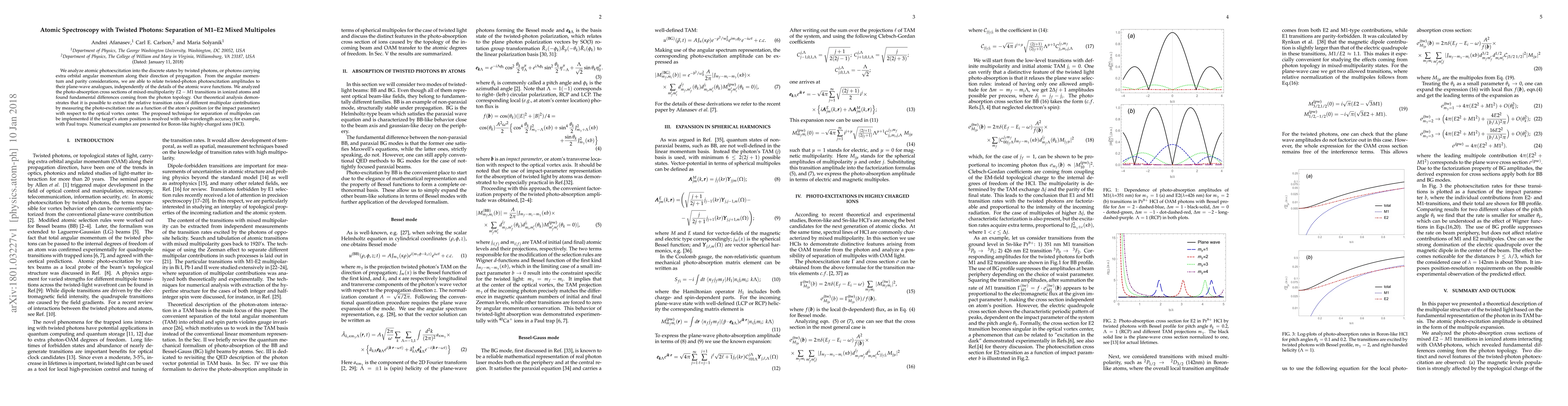 This paper explores atomic photoexcitation using twisted photons, revealing fundamental differences in $E2-M1$ transition rates due to photon topology. The study proposes a method for separating mixed multipolar contributions by measuring excitation rates relative to the atom's position with respect to the optical vortex center.