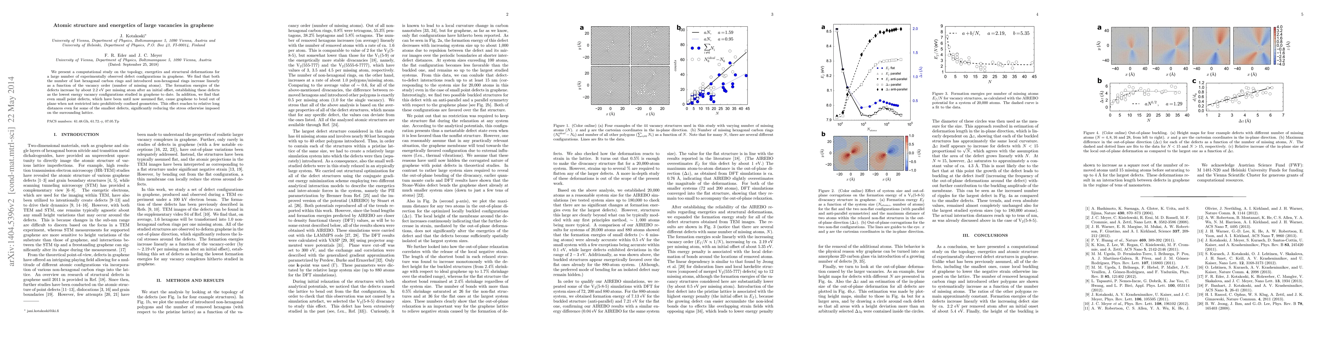 We present a computational study on the topology, energetics and structural deformations for a large number of experimentally observed defect configurations in graphene. We find that both the number of lost hexagonal carbon rings and introduced non-hexagonal rings increase linearly as a function of the vacancy order (number of missing atoms). The formation energies of the defects increase by about 2.2 eV per missing atom after an initial offset, establishing these defects as the lowest energy vacancy configurations studied in graphene to date. In addition, we find that even small point defects, which have been until now assumed flat, cause graphene to bend out of plane when not restricted into prohibitively confined geometries. This effect reaches to relative long distances even for some of the smallest defects, significantly reducing the stress otherwise imposed on the surrounding lattice.