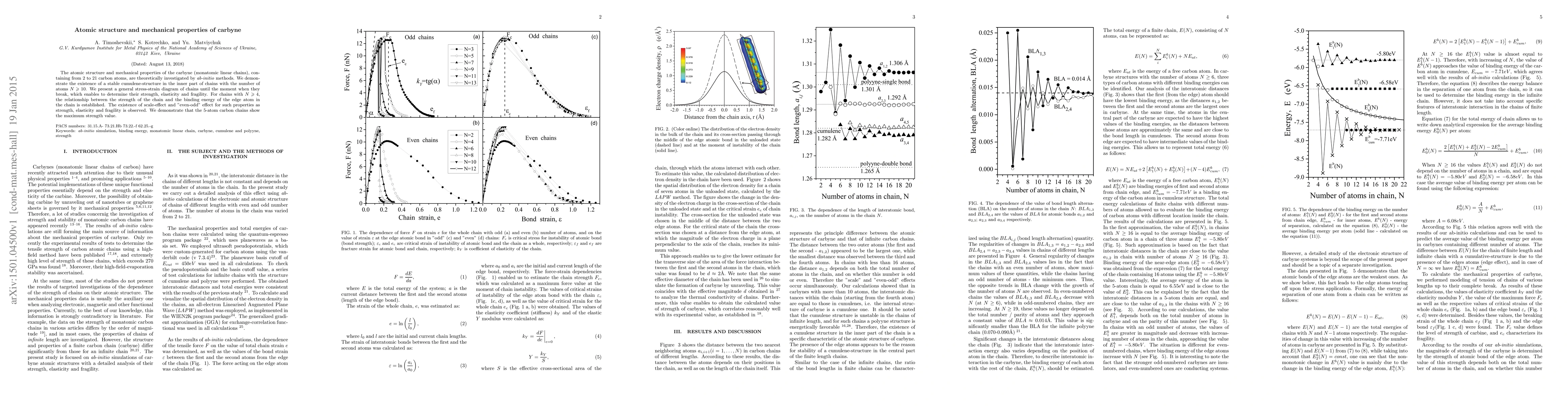 This paper investigates the atomic structure and mechanical properties of carbyne using ab-initio methods, revealing stable cumulene structures in longer chains and establishing a stress-strain diagram to determine strength, elasticity, and fragility. It finds that the 5-atom carbyne chain exhibits maximum strength, with observed scale-effect and "even-odd" effects.