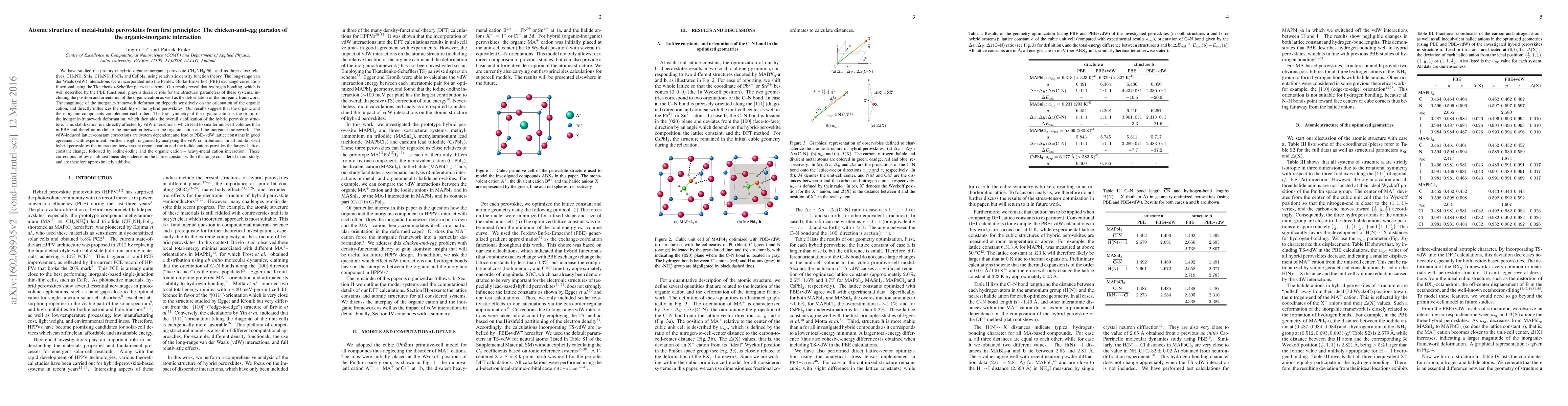 This paper uses relativistic density function theory to study the atomic structure of metal-halide perovskites, focusing on the interplay between organic-inorganic components and van der Waals interactions. It finds that hydrogen bonding and the low symmetry of organic cations significantly influence the inorganic framework's deformation, leading to hybrid perovskite stabilization.