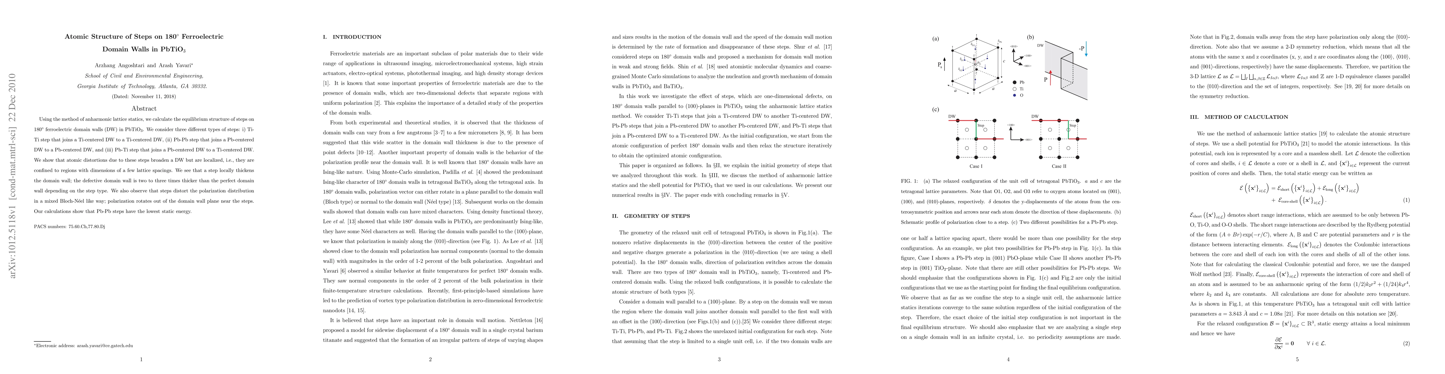 This study uses anharmonic lattice statics to determine the atomic structure of different types of steps on 180° ferroelectric domain walls in PbTiO_3, revealing that these steps broaden but locally confine the domain wall and distort the polarization distribution in a mixed Bloch-Néel manner. Pb-Pb steps exhibit the lowest static energy among the considered types.