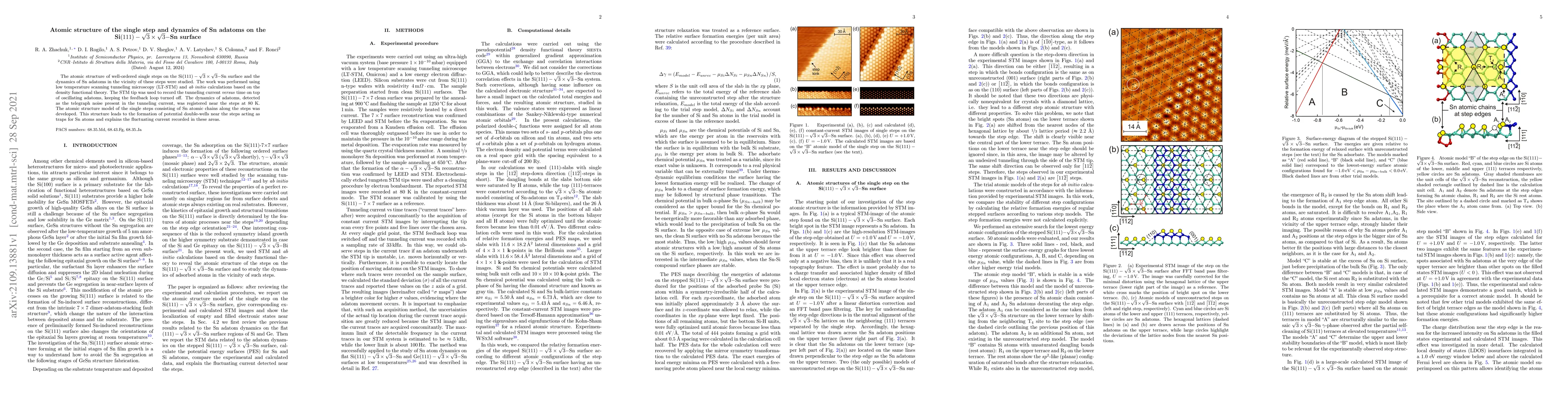 The study used low-temperature scanning tunneling microscopy to investigate the atomic structure and dynamics of Sn adatoms on Si(111)-\sqrt{3}\times\sqrt{3}-Sn surface, revealing Sn atomic chains along single steps and potential double well traps formed near these steps. Ab initio calculations confirmed the adatoms' oscillating behavior as telegraph noise at 80 K.