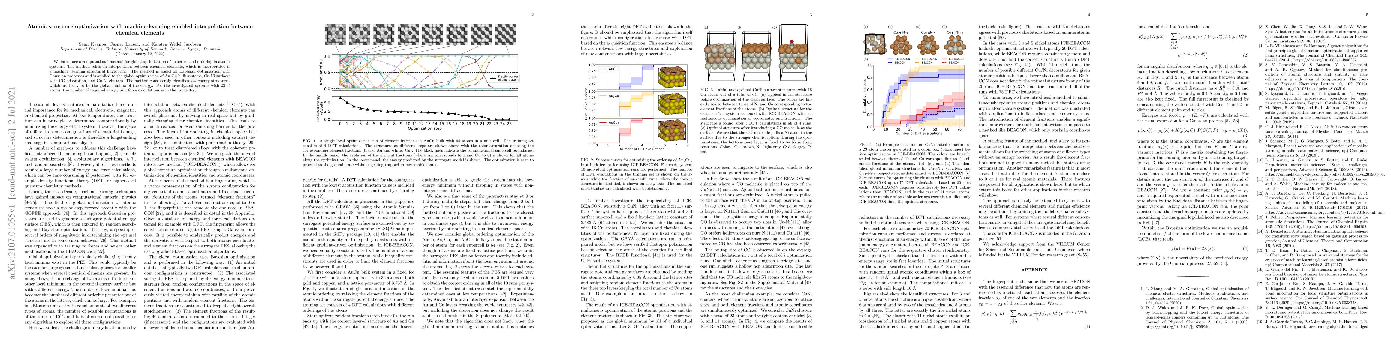 This paper presents a machine-learning-enabled method for optimizing atomic structures using Bayesian optimization with Gaussian processes and interpolation between chemical elements. The method successfully identifies low-energy configurations in Au-Cu bulk systems, Cu-Ni surfaces, and Cu-Ni clusters with minimal computational effort.