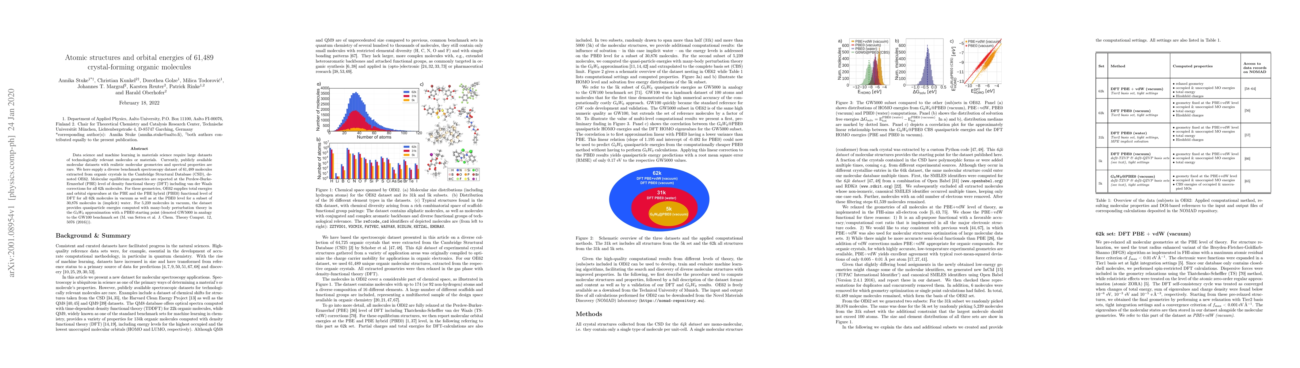 This paper presents a large benchmark dataset, OE62, comprising 61,489 organic molecules extracted from the Cambridge Structural Database, featuring molecular geometries, total energies, and orbital eigenvalues computed using DFT methods. The dataset also includes quasiparticle energies for a subset of molecules using many-body perturbation theory.