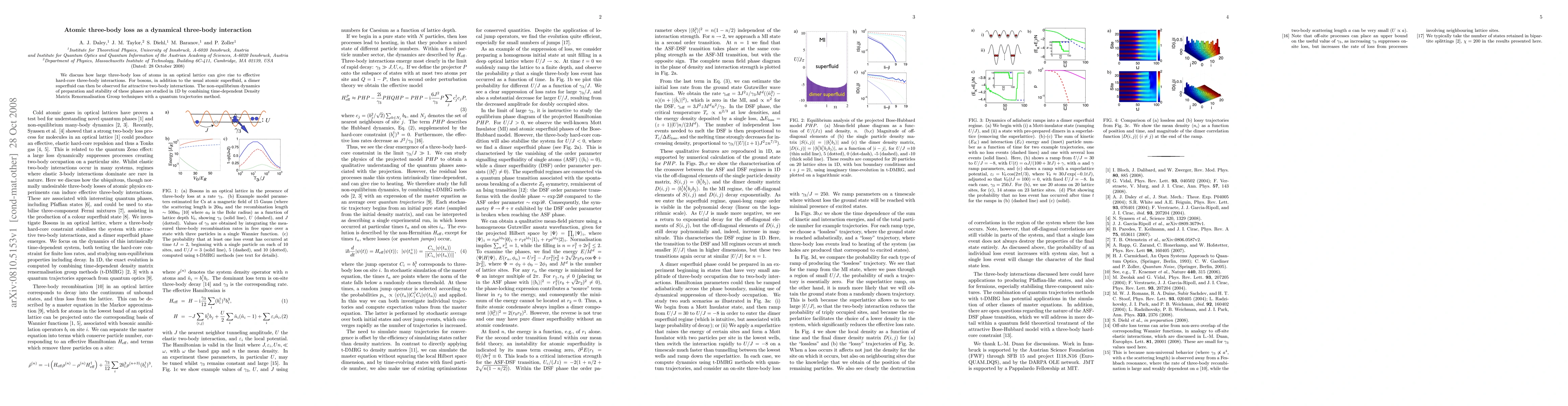 This paper explores how significant three-body loss of atoms in an optical lattice can create effective hard-core three-body interactions, leading to the emergence of a dimer superfluid in addition to the usual atomic superfluid for bosons with attractive two-body interactions. The study employs time-dependent Density Matrix Renormalisation Group and quantum trajectories methods to analyze the non-equilibrium dynamics of these phases in 1D.