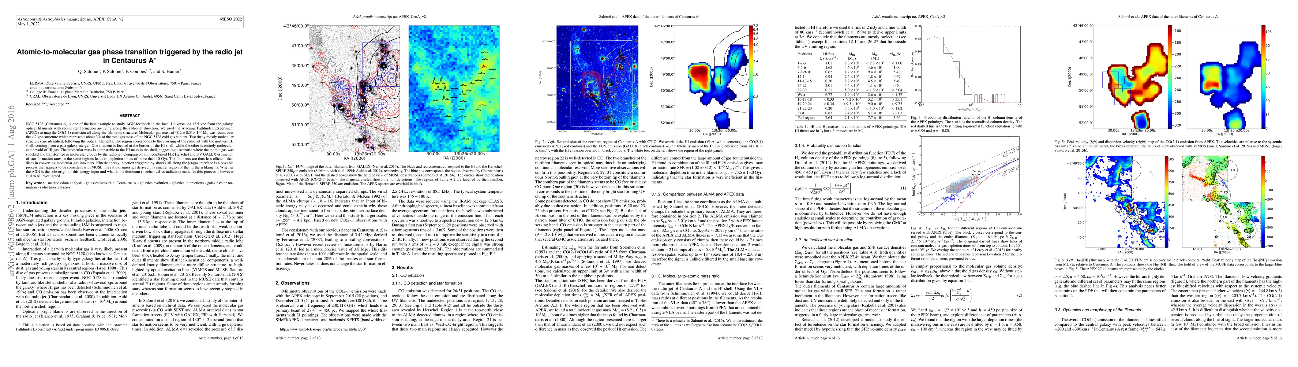 NGC 5128 (Centaurus A) is one of the best example to study AGN-feedback in the local Universe. At 13.5 kpc from the galaxy, optical filaments with recent star formation are lying along the radio-jet direction. We used the Atacama Pathfinder EXperiment (APEX) to map the CO(2-1) emission all along the filaments structure. Molecular gas mass of 8.2x10^7 Msun was found over the 4.2 kpc-structure which represents about 3% of the total gas mass of the NGC 5128 cold gas content. Two dusty mostly molecular structures are identified, following the optical filaments. The region corresponds to the crossing of the radio jet with the northern HI shell, coming from a past galaxy merger. One filament is located at the border of the HI shell, while the other is entirely molecular, and devoid of HI gas. The molecular mass is comparable to the HI mass in the shell, suggesting a scenario where the atomic gas was shocked and transformed in molecular clouds by the radio jet. Comparison with combined FIR Herschel and UV GALEX estimation of star formation rates in the same regions leads to depletion times of more than 10 Gyr. The filaments are thus less efficient than discs in converting molecular gas into stars. Kinetic energy injection triggered by shocks all along the jet/gas interface is a possible process that appears to be consistent with MUSE line ratio diagnostics derived in a smaller region of the northern filaments. Whether the AGN is the sole origin of this energy input and what is the dominant (mechanical vs radiative) mode for this process is however still to be investigated.