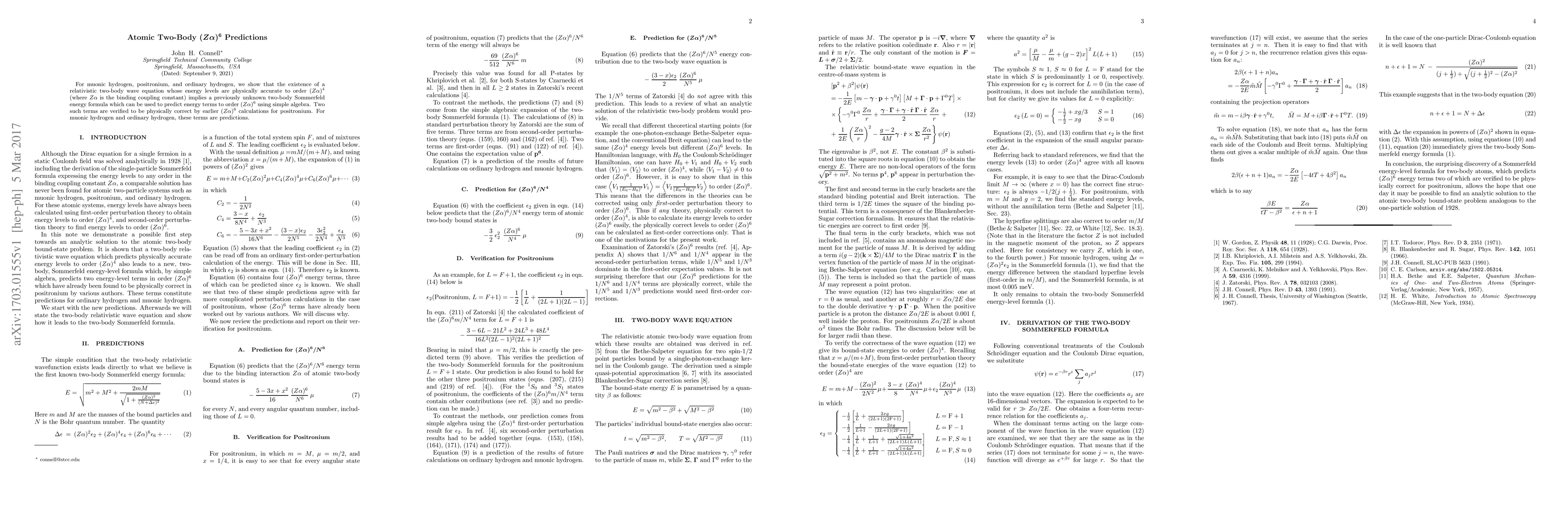 For muonic hydrogen, positronium, and ordinary hydrogen, we show that the existence of a relativistic two-body wave equation whose energy levels are physically accurate to order $(Z\alpha )^4$ (where $Z\alpha$ is the binding coupling constant) implies a previously unknown two-body Sommerfeld energy formula which can be used to predict energy terms to order $(Z\alpha )^6$ using simple algebra. Two such terms are verified to be physically correct by earlier $(Z\alpha )^6$ calculations for positronium. For muonic hydrogen and ordinary hydrogen, these terms are predictions.