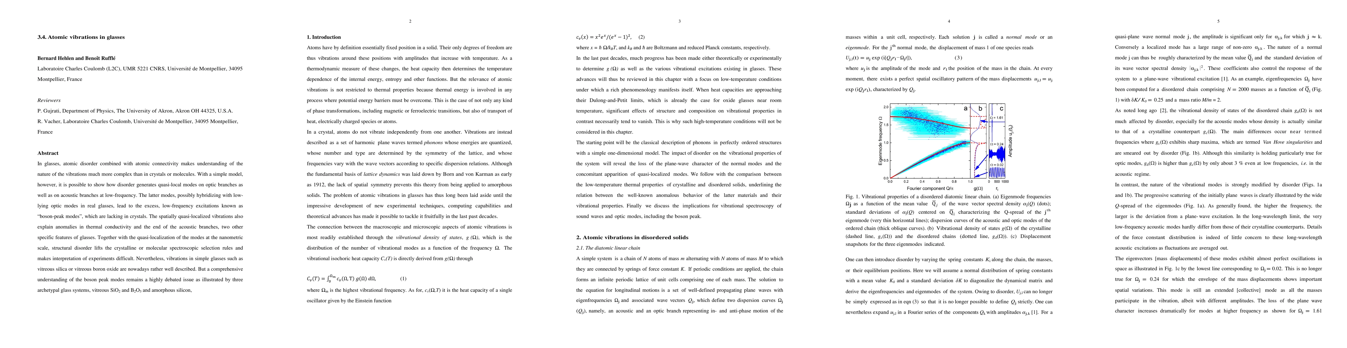 This paper explores atomic vibrations in glasses, showing how disorder generates quasi-local modes, particularly the boson-peak modes, which are absent in crystals. It also explains anomalies in thermal conductivity and the end of acoustic branches in glasses, highlighting the complexity of interpreting these vibrations due to structural disorder.
