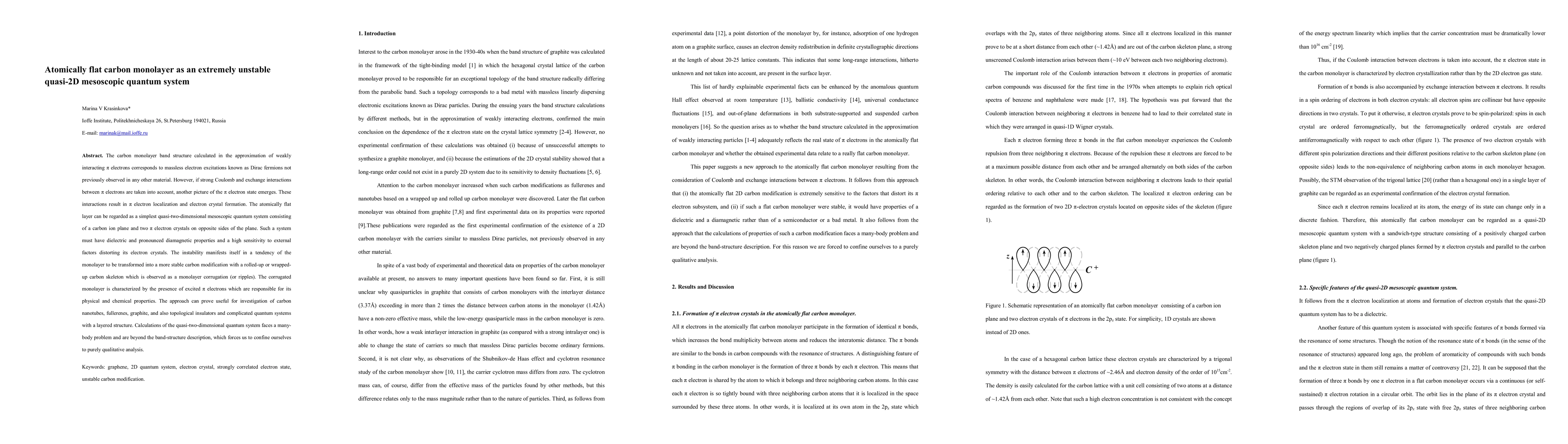 The carbon monolayer band structure calculated in the approximation of weakly interacting {\pi} electrons corresponds to massless electron excitations known as Dirac fermions not previously observed in any other material. However, if strong Coulomb and exchange interactions between {\pi} electrons are taken into account, another picture of the {\pi} electron state emerges. These interactions result in {\pi} electron localization and electron crystal formation. The atomically flat layer can be regarded as a simplest quasi-two-dimensional mesoscopic quantum system consisting of a carbon ion plane and two {\pi} electron crystals on opposite sides of the plane. Such a system must have dielectric and pronounced diamagnetic properties and a high sensitivity to external factors distorting its electron crystals. The instability manifests itself in a tendency of the monolayer to be transformed into a more stable carbon modification with a rolled-up or wrapped-up carbon skeleton which is observed as a monolayer corrugation (or ripples). The corrugated monolayer is characterized by the presence of excited {\pi} electrons which are responsible for its physical and chemical properties. The approach can prove useful for investigation of carbon nanotubes, fullerenes, graphite, and also topological insulators and complicated quantum systems with a layered structure. Calculations of the quasi-two-dimensional quantum system faces a many-body problem and are beyond the band-structure description, which forces us to confine ourselves to purely qualitative analysis