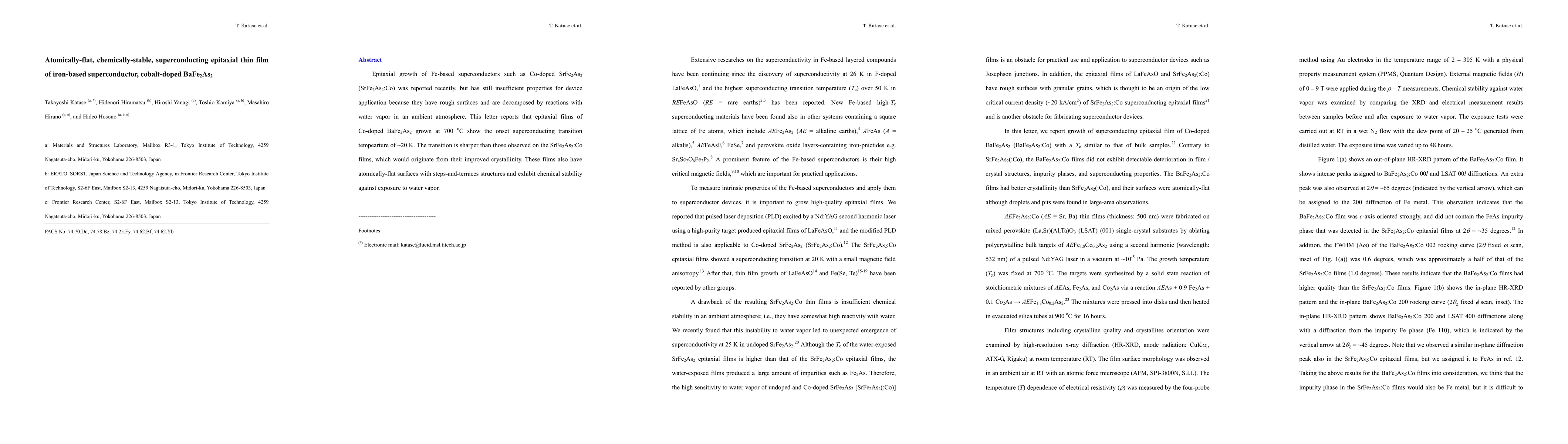 This paper reports the epitaxial growth of cobalt-doped BaFe$_2$As$_2$ thin films, achieving a sharper superconducting transition temperature of 20 K compared to SrFe$_2$As$_2$:Co films due to better crystallinity. The films feature atomically-flat surfaces and demonstrate chemical stability against water vapor.